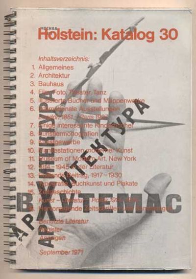 Frankfurt: Jürgen Holstein Antiquariat, 1971. First edition. Spiral Bound. Octavo [24 cm] Metal spiral binding with pictorial wraps, and an additional clear plastic front wrap, with the title and contents printed in red. Very good. German text. A catalogue produced by the Frankfurt bookseller, Jürgen Holstein Antiquariat, with the theme, "modern art and literature." Inhaltsverzeichnis: Allgemeines; Architektur; Bauhaus; Film, Foto, Theater, Tanz; Illustrierte Bücher und Mappenwerke; Internationale Ausstellungen London 1851 - Paris 1937; Einige interssante Kinderbücher; Künstlermonografien; Kunstgewerbe; Manifestationen moderner Kunst; Museum of Modern Art, New York; 1914-1945 in der Literatur; Rußlands Beitrag, 1917-1930; Typografie, Buchkunst und Plakate; Zeitgeschichte, Kunst- Literatur- Politik 1914-1945; Hervorragende Zeitschriften und Sammlungen.