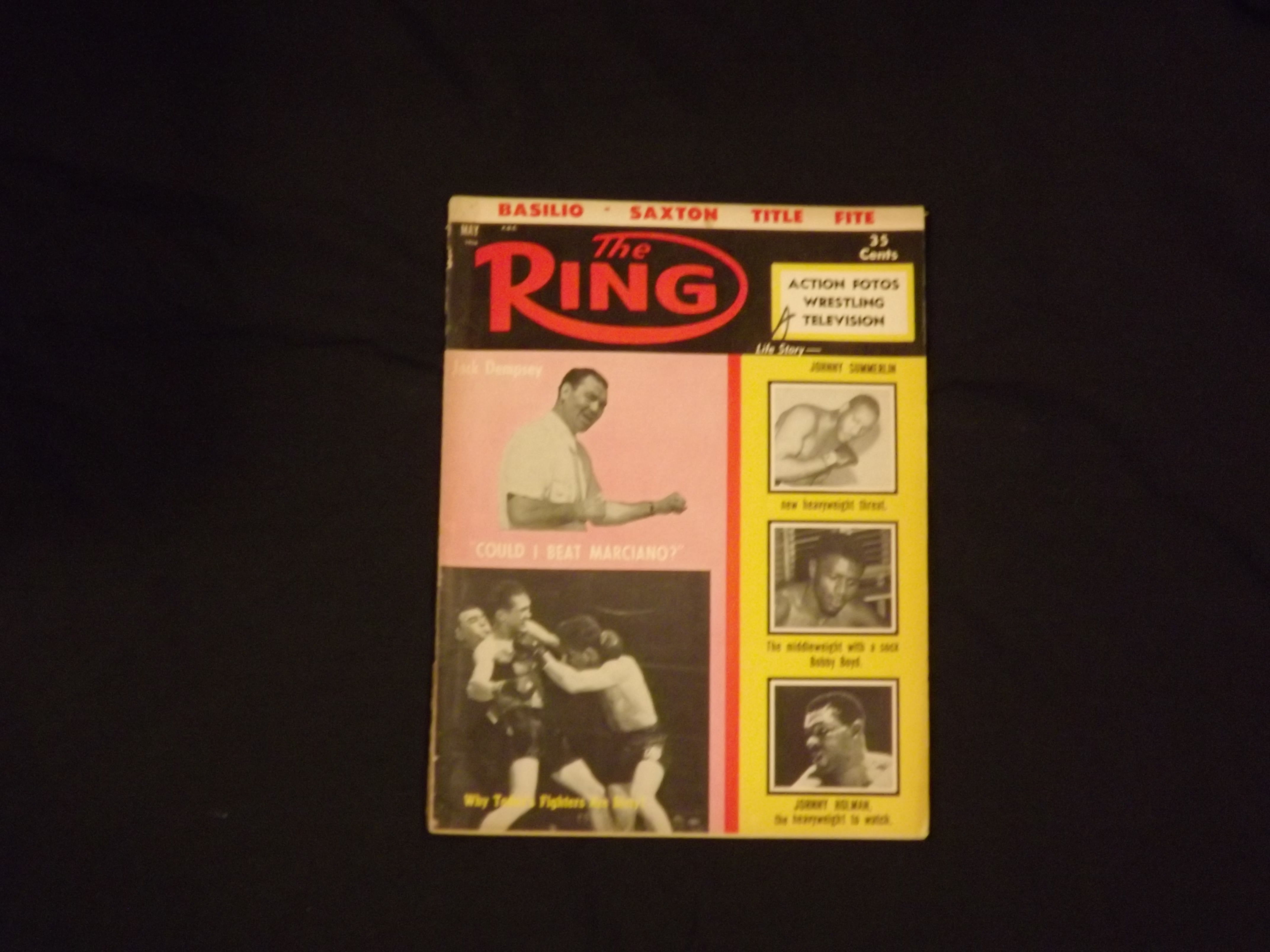 4to, magazine, glossy covers, illustrated, 66 pp. Archival tape repair to spine, some minor edgewear, covers generally bright and clean, letter A on front cover, normal aging and browning; otherwise about very good. This issue includes a feature article on how former champ Jack Dempsey feels about current heavyweight champion Rocky Marciano. This issue also incudes an article on the Basilio – Saxton fight, and a tribute to Sam Langford, the legendary "Negro" fighter from the early days of the 20th century.