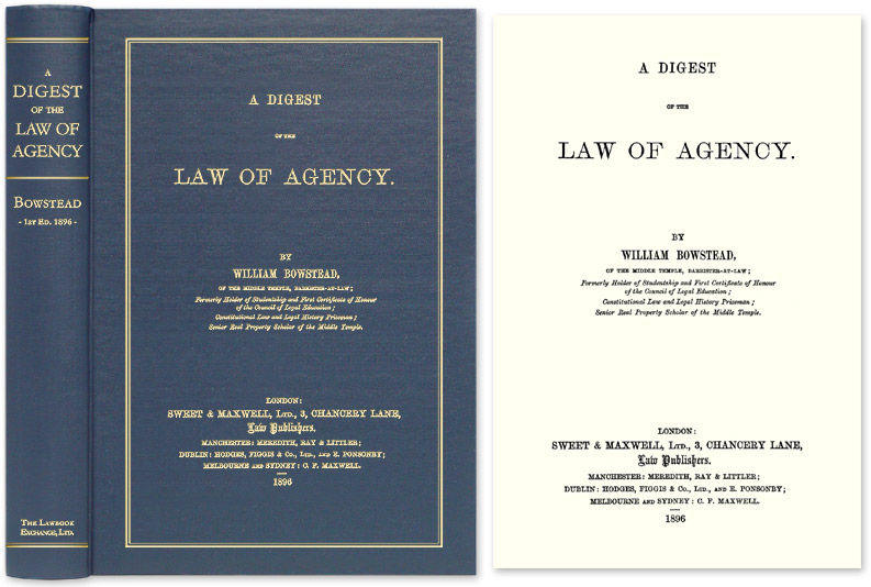 2007. ISBN-13: 9781584777007; ISBN-10: 1584777001. Classic Treatise on Agency Bowstead, William. A Digest of the Law of Agency. Originally published: London: Sweet & Maxwell, 1896. xxxvii, 394 pp. Reprinted 2007 by The Lawbook Exchange, Ltd. ISBN-13: 9781584777007. ISBN-10: 1584777001. Hardcover. New. $95. * Reprint of the first edition. The sixteenth edition of this classic treatise was published in 1996. Esteemed for its clarity, it reduces the law of agency to a series of abstract propositions arranged under headings and articles and illustrated by relevant cases. "The work has been carefully done. We have tested the text, the cases cited, and the index, and have in each case found a clear and correct statement of the point or of the authorities for which we sought. The style is concise, and the contents are free from anything superfluous or redundant.": S.H.L., Law Quarterly Review 12 (1896) 288.