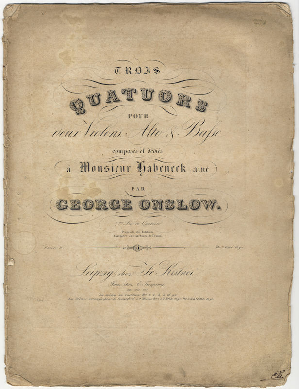 "[A] French composer of English descent... Onslow’s string quartets and quintets are the pinnacle of his output. His youthful quartets (opp.4, 8, 9, and 10) are notable for great flexibility of writing, exceptional rhythmic and melodic charm, and great vitality... In 1832 he returned to the form with new and sudden vigour probably as a result of his discovery of Beethoven’s late quartets. Both shocked and fascinated by these, he composed the 12 most important of all his quartets (opp.46 to 56) over a period of two years. Of greater density, and with even greater interplay between the voices, these works show great emotional intensity, opening up the way to new harmonic and rhythmic daring, and contain movements of striking beauty. Onslow’s work was particularly successful in Germany and Austria throughout the first half of the 19th century, as the many editions of his works show." Viviane Niaux in Grove Music Online.