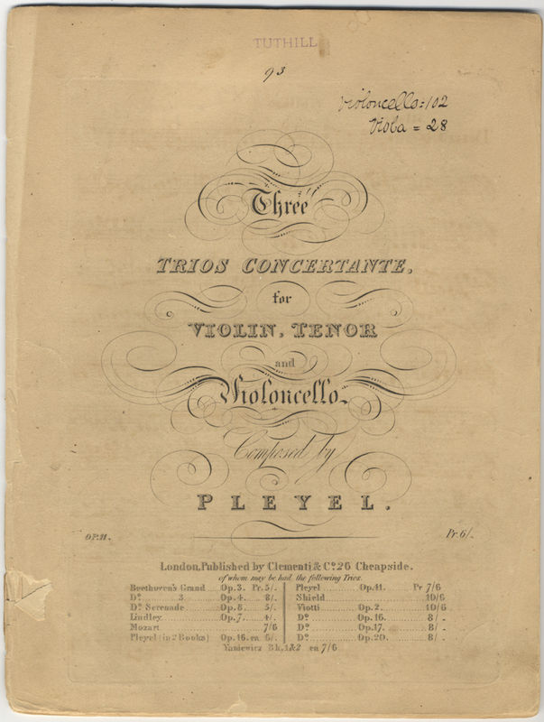 Browned and fragile; most leaves detached and frayed at edges and spine, with loss to blank areas. An unrecorded edition. Neither Benton nor RISM list any editions with the titling "Three Trios Concertante" or billing the viola as "tenor." The edition by Longman, Clementi & Co. (Benton 4020; RISM P3510) has a different title. Dated according to Humphries-Smith p. 107. The three works were first published in 1787.