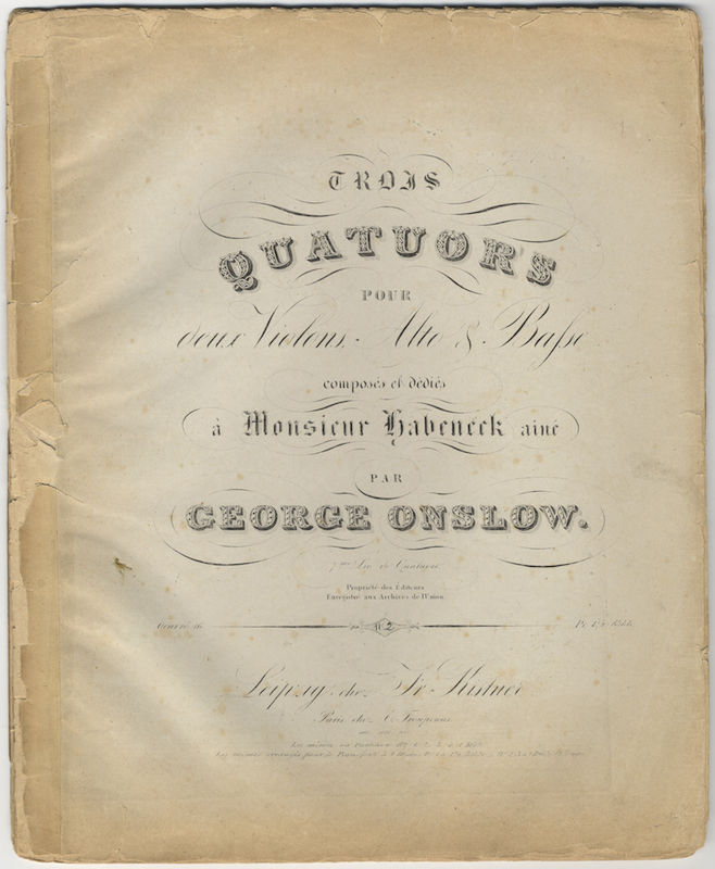 "[A] French composer of English descent... Onslow’s string quartets and quintets are the pinnacle of his output. His youthful quartets (opp.4, 8, 9, and 10) are notable for great flexibility of writing, exceptional rhythmic and melodic charm, and great vitality... In 1832 he returned to the form with new and sudden vigour probably as a result of his discovery of Beethoven’s late quartets. Both shocked and fascinated by these, he composed the 12 most important of all his quartets (opp.46 to 56) over a period of two years. Of greater density, and with even greater interplay between the voices, these works show great emotional intensity, opening up the way to new harmonic and rhythmic daring, and contain movements of striking beauty. Onslow’s work was particularly successful in Germany and Austria throughout the first half of the 19th century, as the many editions of his works show." Viviane Niaux in Grove Music Online.
