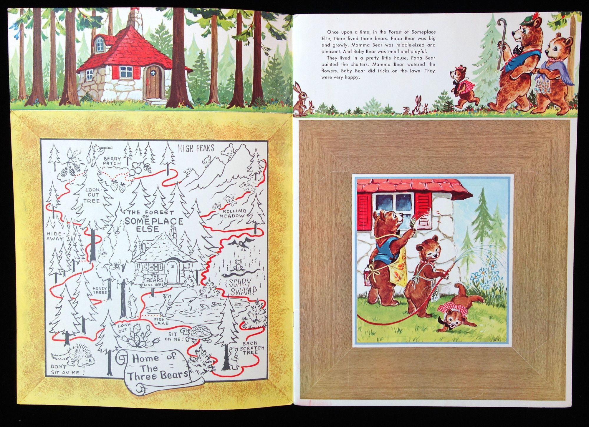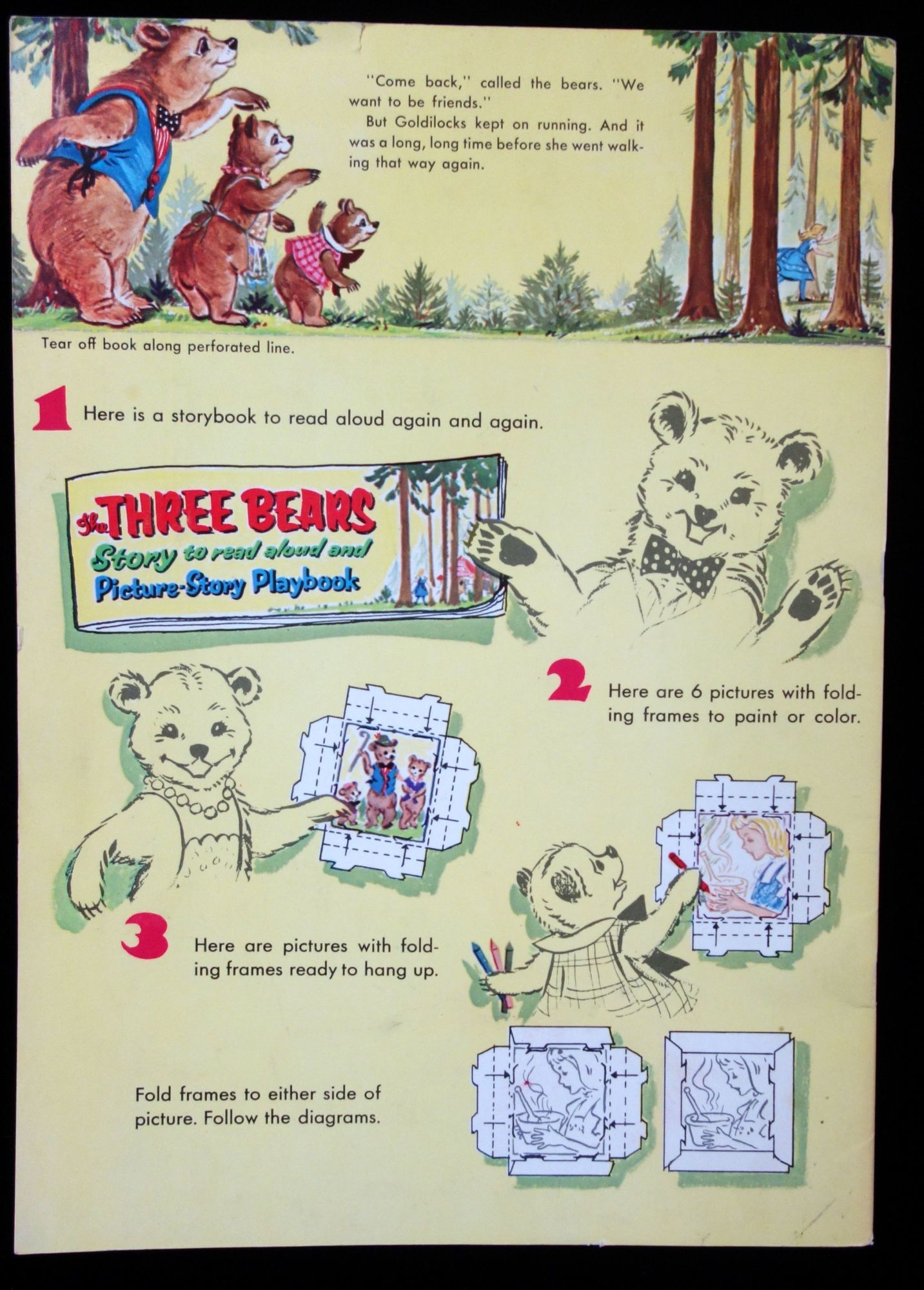 Racine: Whitman Publishing, 1964. Fine. 16 pages (including covers), uncut, of activities and punch out pieces that together tell the classic story of The Three Bears. Each page has a little bit of the story on it, and at least one activity. Most of the pages are "Self Framing Pictures to push out and put together," some of which are meant to be colored in. Published by Whitman and it is No. 1947. Very slight edge wear, and one intact tear to the top of the back cover. Measures 14" x 10