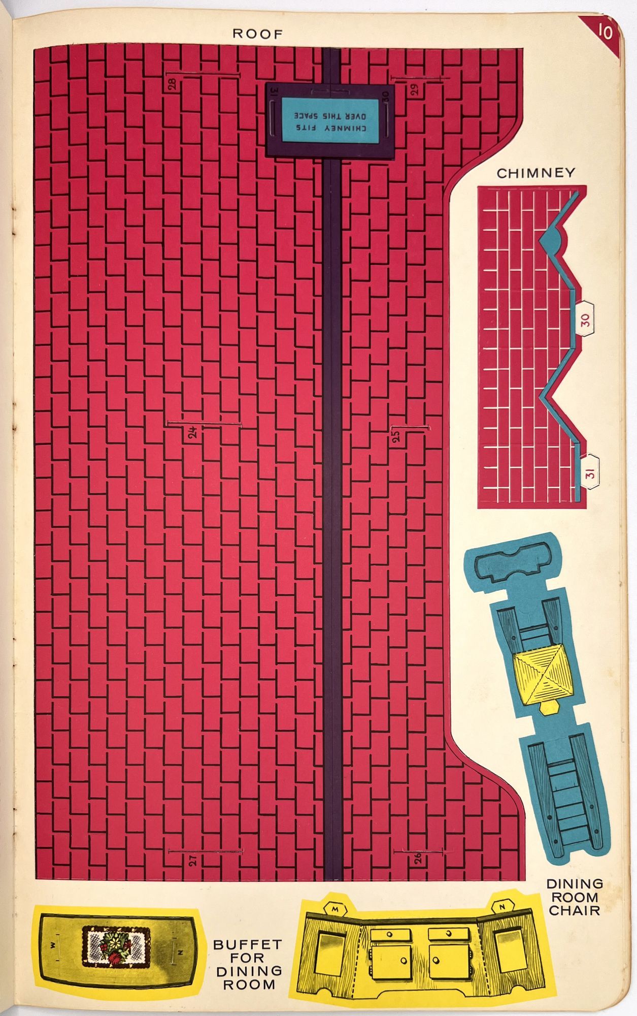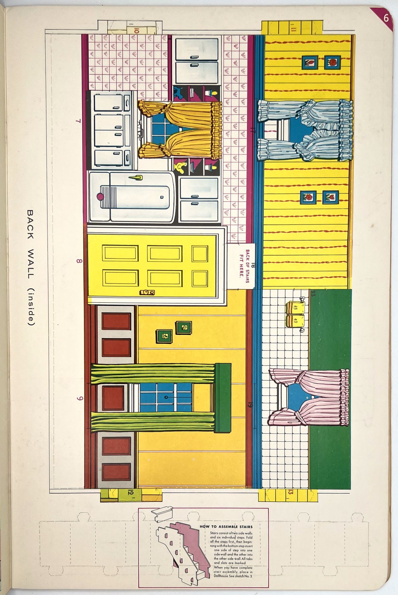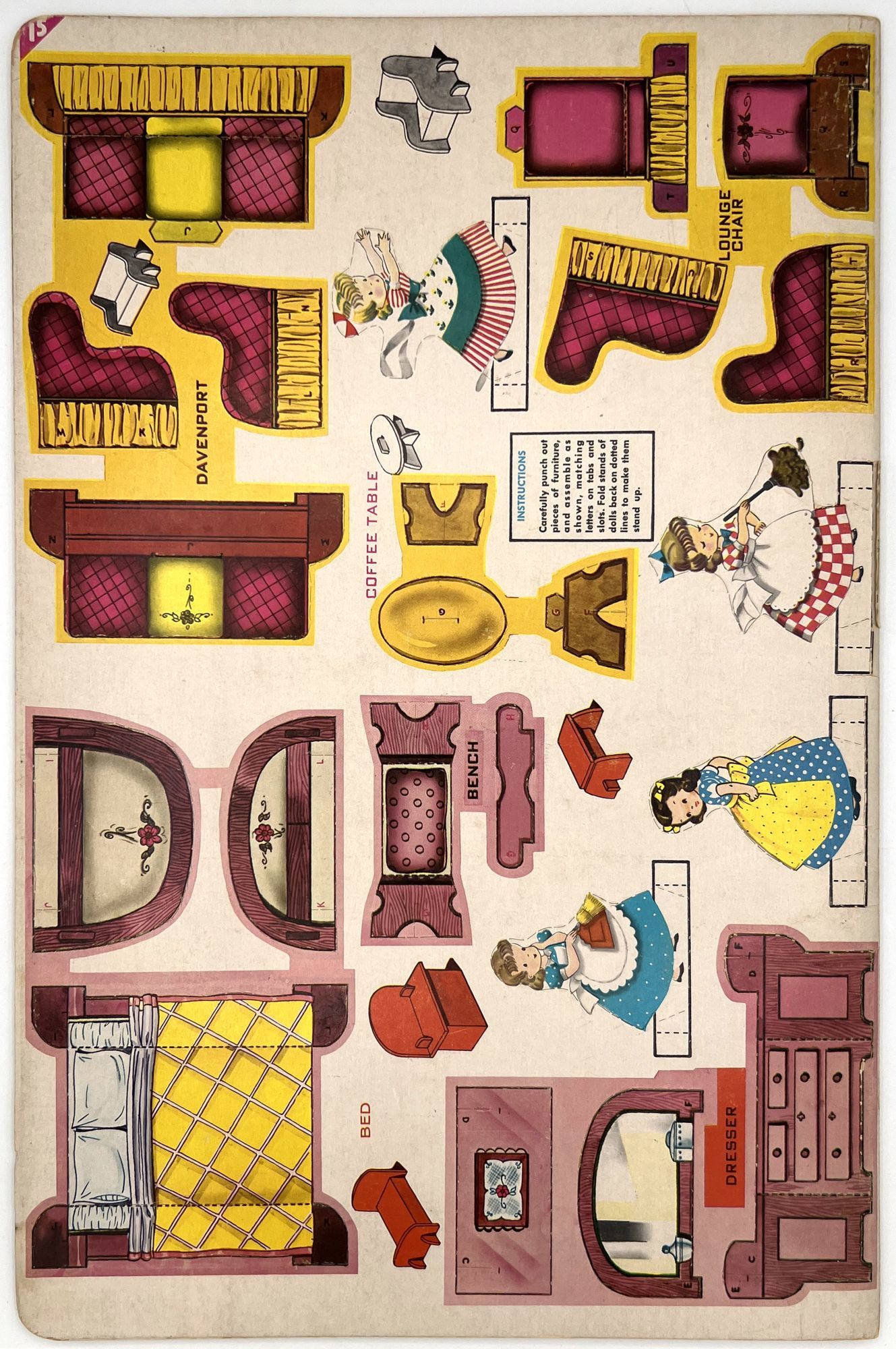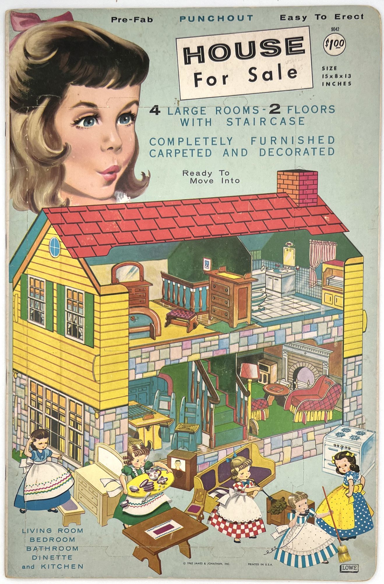 USA: Lowe Publishing, 1962. Fine. A 19" x 12" punch out litho on heavy stock book with 8 double sided color pages. When constructed the house measures 15" x 8"x 13" with 4 large rooms, 2 floors with a staircase, completely furnished, carpeted and decorated. The instructions are on the inside front cover. Minor wear, overall great condition. Copyrighted by James & Jonathan Inc.