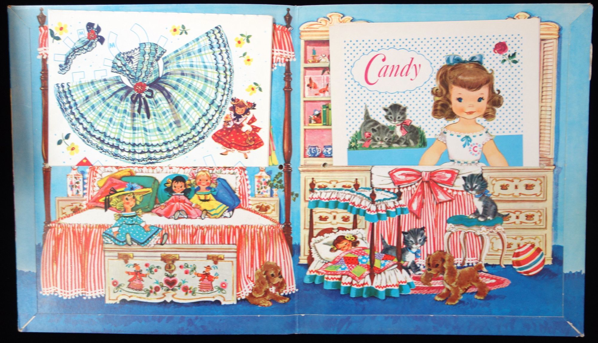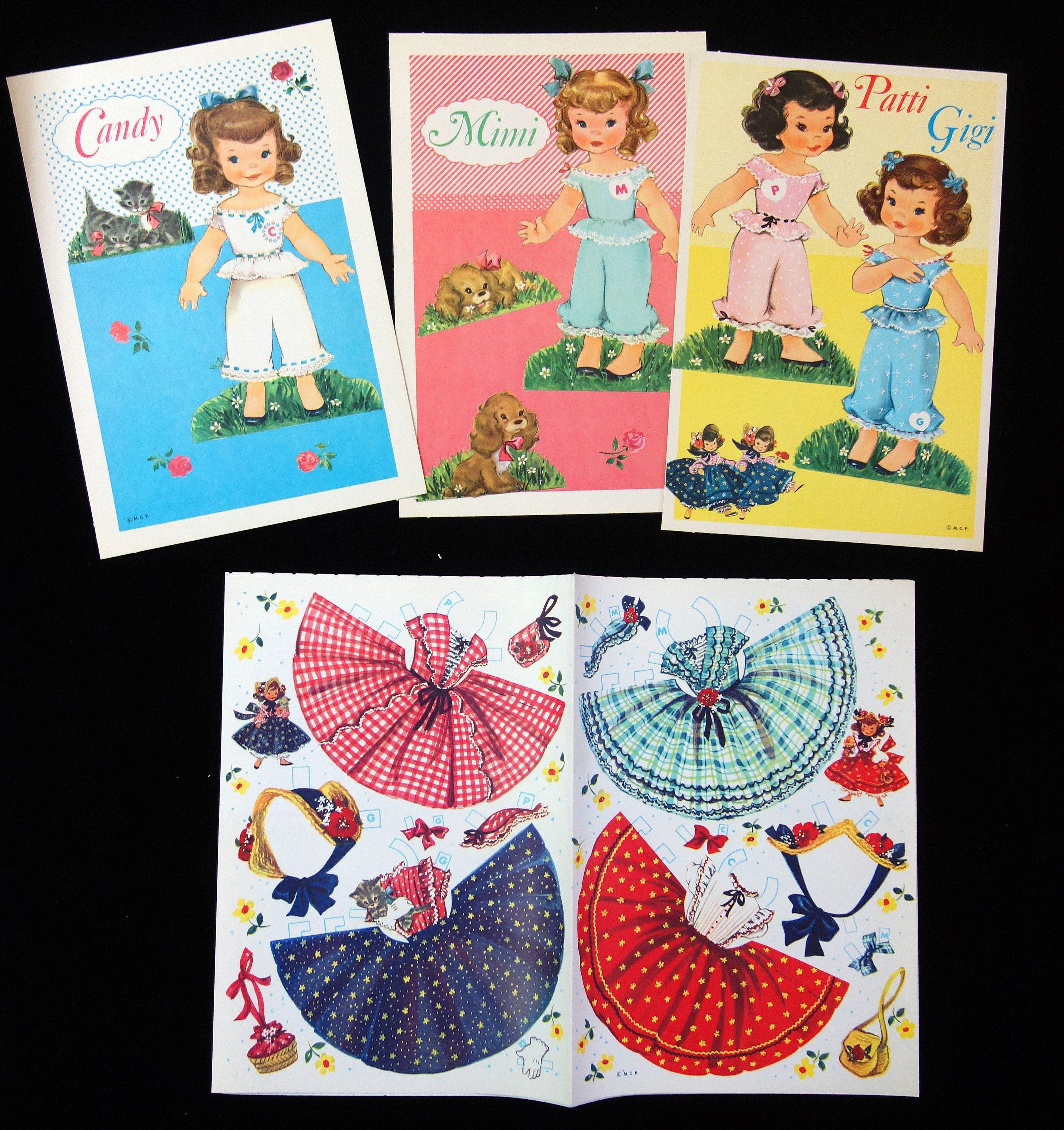 Chicago: Merrill Publishing Company, 1961. Very Good. A total of 4, uncut, litho print punch out dolls and their pets. The dolls names are Candy, Patti, Gigi, and Mimi. There are 4 folded costume pages, with each doll having three cut out dress, one winter coat, and various accessories. The skirts of the dresses are 'wrap-a-round'. No. 2581. Minimal edge wear covers, and the folded costume pages have started to separate along the perforated edge in-between the pages. Measures 12" x 10", largest doll is 7