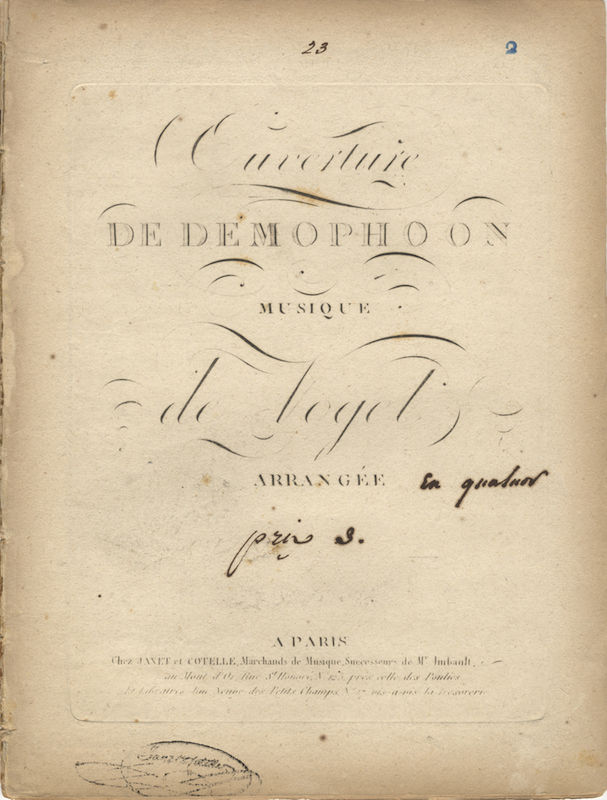 Some browning, bleeding and offsetting; Volino secondo part somewhat foxed. Not in RISM, WorldCat, or KVK. The imprint suggests that the edition is a reprint/Titelauflage of Imbault's (cf. RISM V2272, for string quartet with oboes and horns ad libitum); Janet & Cotelle bought Imbault's business in 1812. Imbault assigned the same plate number (112), combined with varying letters, to all of his arrangements of the opera (see RISM VV2277a for two clarinets, two horns, and two bassoons, VV 2289a for two clarinets, and V2299 [with a suggested date of 1795] for piano); "Q" most probably stands for "quatuor."