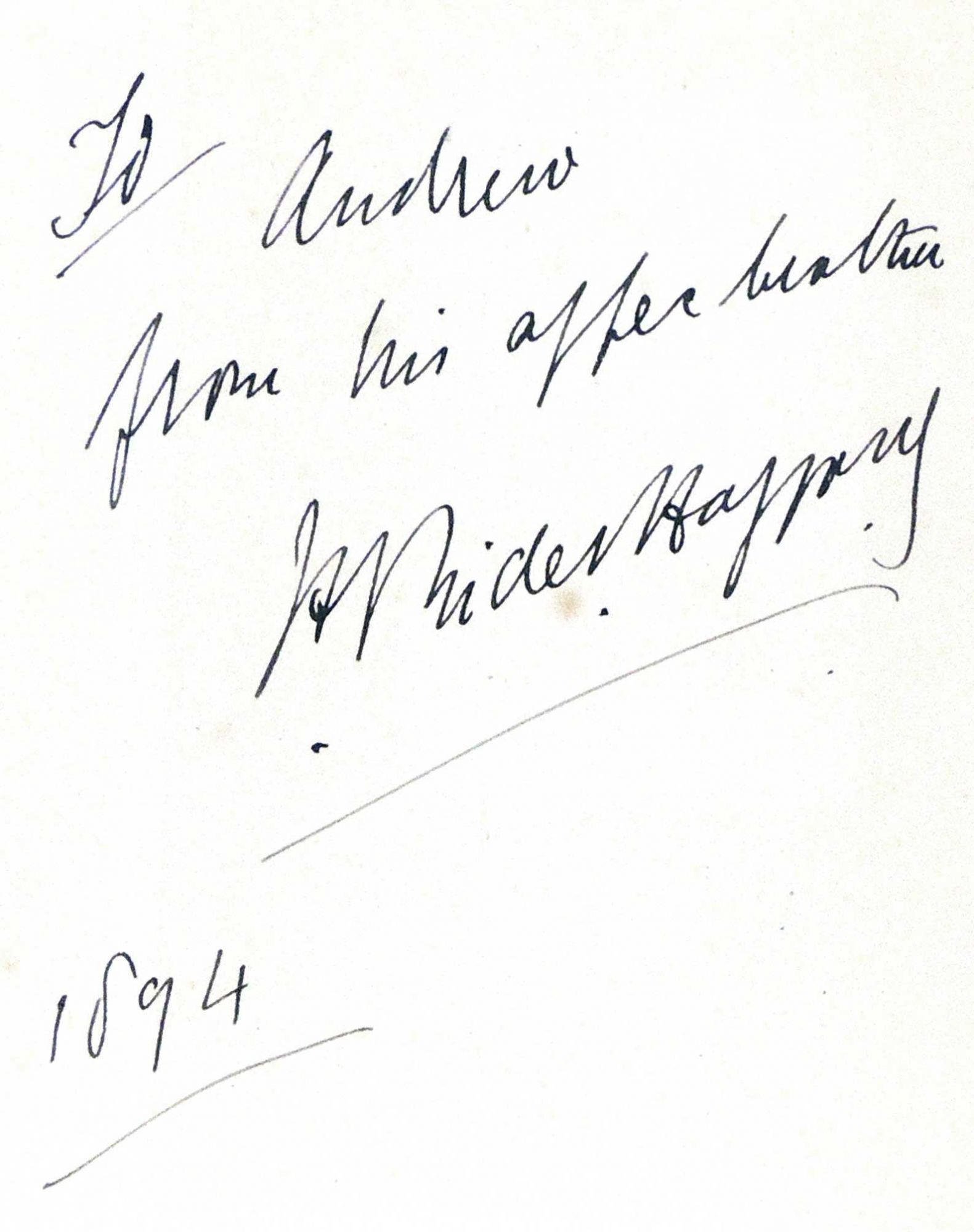 London: Longmans, Green, and Co, 1893. Hardcover. Very Good. Maurice Greiffenhagen. Maurice Greiffenhagen. Hardcover. First Edition of this Aztec adventure story involving a shipwreck, a brush with the Spanish Inquisition, murder, slavery, romance, and more. Author's Presentation Copy, inscribed "To Andrew from his affec brother H Rider Haggard 1894." Henry Rider Haggard (1856-1925) was the author of a number of adventure novels set in exotic locales. His books, including She and King Solomon's Mines, are still popular today. Haggard traveled to Mexico in 1891 to do research for this book and sadly his young son died while he was away. The book describes the first interactions between the Spanish and South American natives, as well as murders, shipwrecks, and slavery. Colonel Andrew Haggard, who had a distinguished military career - he was one of he first British officers to command in the Egyptian army - was also a successful novelist, travel writer and poet. It is known that Andrew helped Rider with the writing of Dawn and he likely played an important role in helping his younger brother with the several bestsellers which revolved around Egypt and mummies. There are 25 black and white illustrations by the British painter and illustrator Maurice Greiffenhagen. He was Haggard's friend, which led him to illustrate several of his adventure books, starting with She in 1889. Bound in the original publisher's blue-green cloth with gilt author and title to front cover and spine. Light bumping, small chip to bottom of faded spine. Hinges a bit tender but text block is tight. Interior pages are clean. Bookplate of collector Mark Samuels Lasner to front pastedown. Very good condition. 325 pages plus 24 page publisher's catalog. LIT/012016.