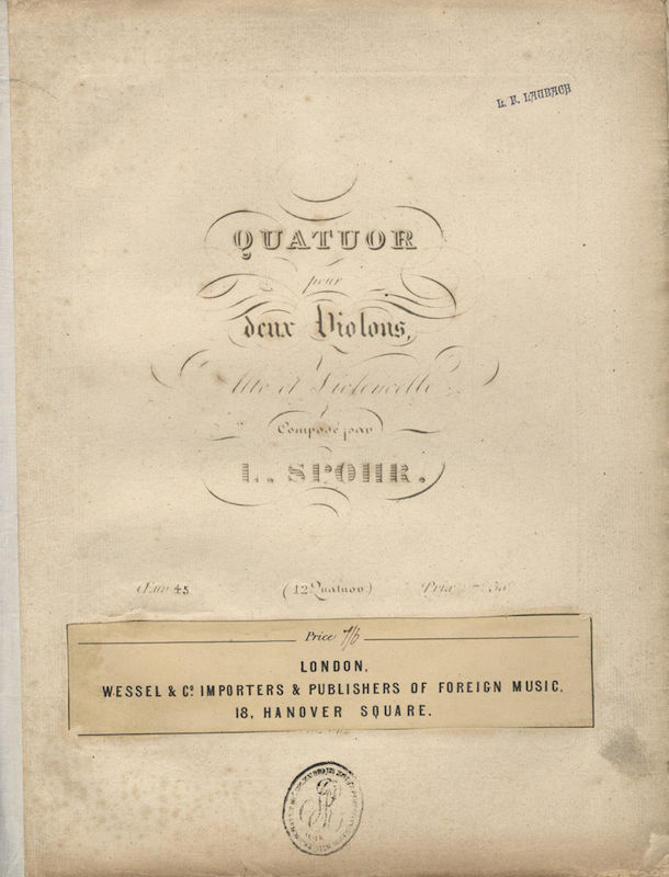 An uncut copy. First French edition of Spohr's 12th quartet, in C major. Part of the complete edition of Spohr's quartets to date. Göthel p. 82. Devriès-Lesure II, p. 365. WorldCat (1 copy only, at the Koninklijke bibliotheek, The Hague. The overpaste dates from 1856-60 (see Humphries & Smith p. 328).