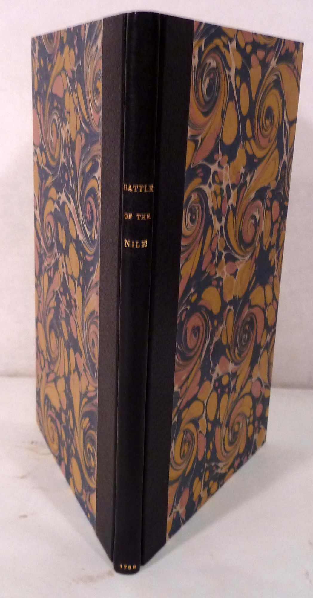 London: Printed For T. Cadell, Jun, and W. Davies, 1798. Second edition. Hardcover. Modern quarter morocco and marbled boards. Fine. 56 pages. 21 x 13 cm. With folding copper-engraved plan of the Battle of the Nile, also called the Battle of Abu Quir, one of Nelson's greatest victories, restoring the British presence in the Mediterranean and dooming Napoleon's venture in Egypt. Sir Edward Berry, 1768-1831, was captain of the flagship during the battle, and when Nelson was wounded, prevented him from falling by catching him in his arms. Berry afterwards published the above work anonymously. Berry is said to have been the only officer in the navy, of his time, except vice-admiral Collingwood, who had three medals, having commanded a ship in three general actions -- the Nile, Trafalgar, and St. Domingo. The DNB calls this work, "a pamphlet which under the special circumstances of its authorship, is of singular interest and value." Clean, fresh copy with plan in excellent condition.