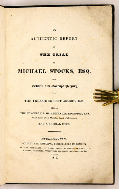 1815. London, 1815. OCLC locates no copies this imprint.. London, 1815. OCLC locates no copies this imprint. Fraud In The Yorkshire Coal Fields [Trial]. Stocks, Michael, Defendant. An Authentic Report Of The Trial Of Michael Stocks, Esq. For Wilful And Corrupt Perjury, At The Yorkshire Lent Assizes, 1815. Before The Honourable Sir Alexander Thompson, Knt. Chief Baron Of His Majesty's Exchequer, And A Special Jury. Huddersfield: Sold by the Principal Booksellers in London; And the Booksellers of York, Leeds, Bradford, Huddersfield, Halifax, Sheffield, Wakefield, Rochdale, Manchester, &c., 1815. 116 pp. Octavo (8-1/4" x 5-1/4"). Stab-stitched pamphlet bound into nineteenth-century unlettered pebbled cloth. Light rubbing to extremities with light wear to spine ends, corners bumped, minor spotting to boards. Light toning to text, finger smudges and light foxing to a few leaves. A very good copy. $500. * First edition, second issue (with the errata all corrected). Stocks was accused of stealing and selling 10,000 tons of coal from mines in Northowram, in the West-Riding of Yorkshire, he owned in partnership with two other men. Stocks was not convicted. The trial details the contractual history of the partnership, such contentious matters as the exact legal boundaries of neighboring mines and coal-pits and the nature of written and verbal agreements. OCLC locates no copies of this imprint. 1 copy located at the Library of Congress.