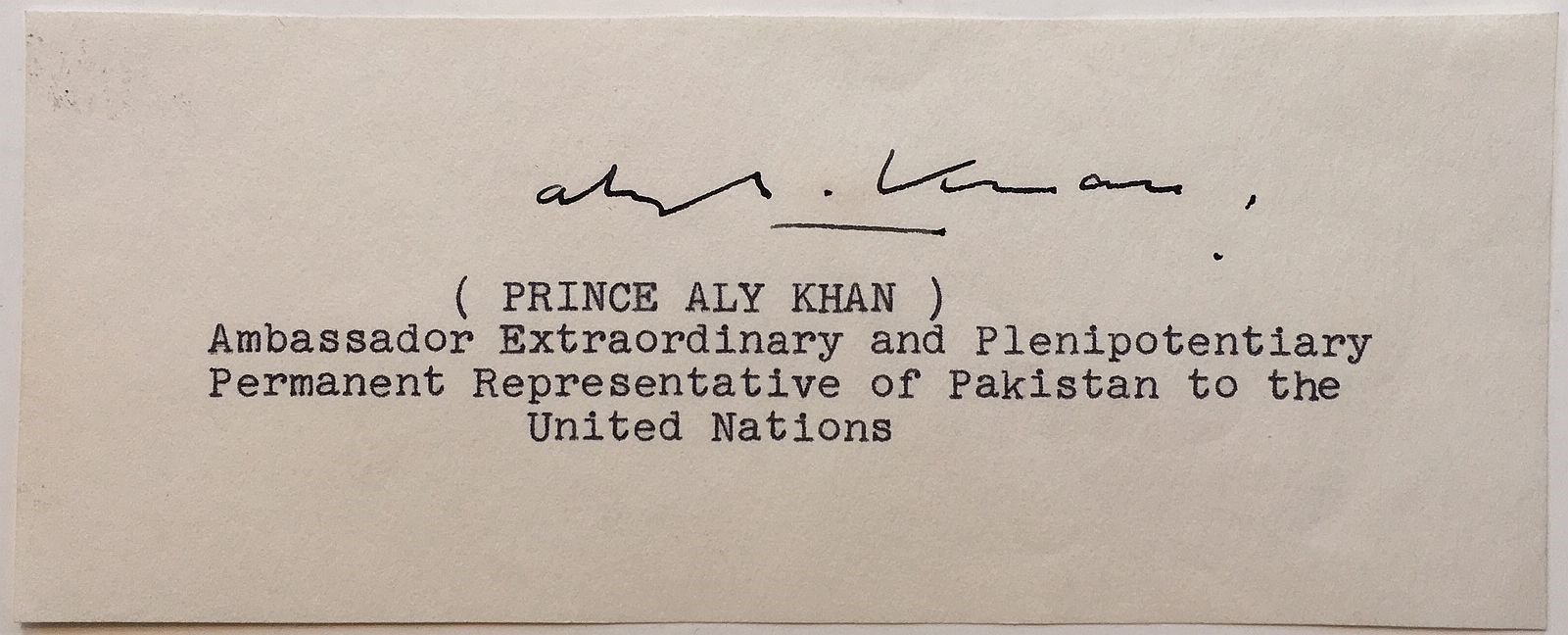 1957. unbound. Signed "Ali S. Aga Khan" on a souvenir page measuring 2.25 x 5.75 inches, no place, no date, circa 1957, identifying him as Ambassador Extraordinary and Plenipotentiary - Permanent Representative of Pakistan to the United Nations. Collectors of United Nations material have always realized the difficulty in acquiring anything signed by Khan during his tenure with that agency. Boldly signed and in near fine condition.