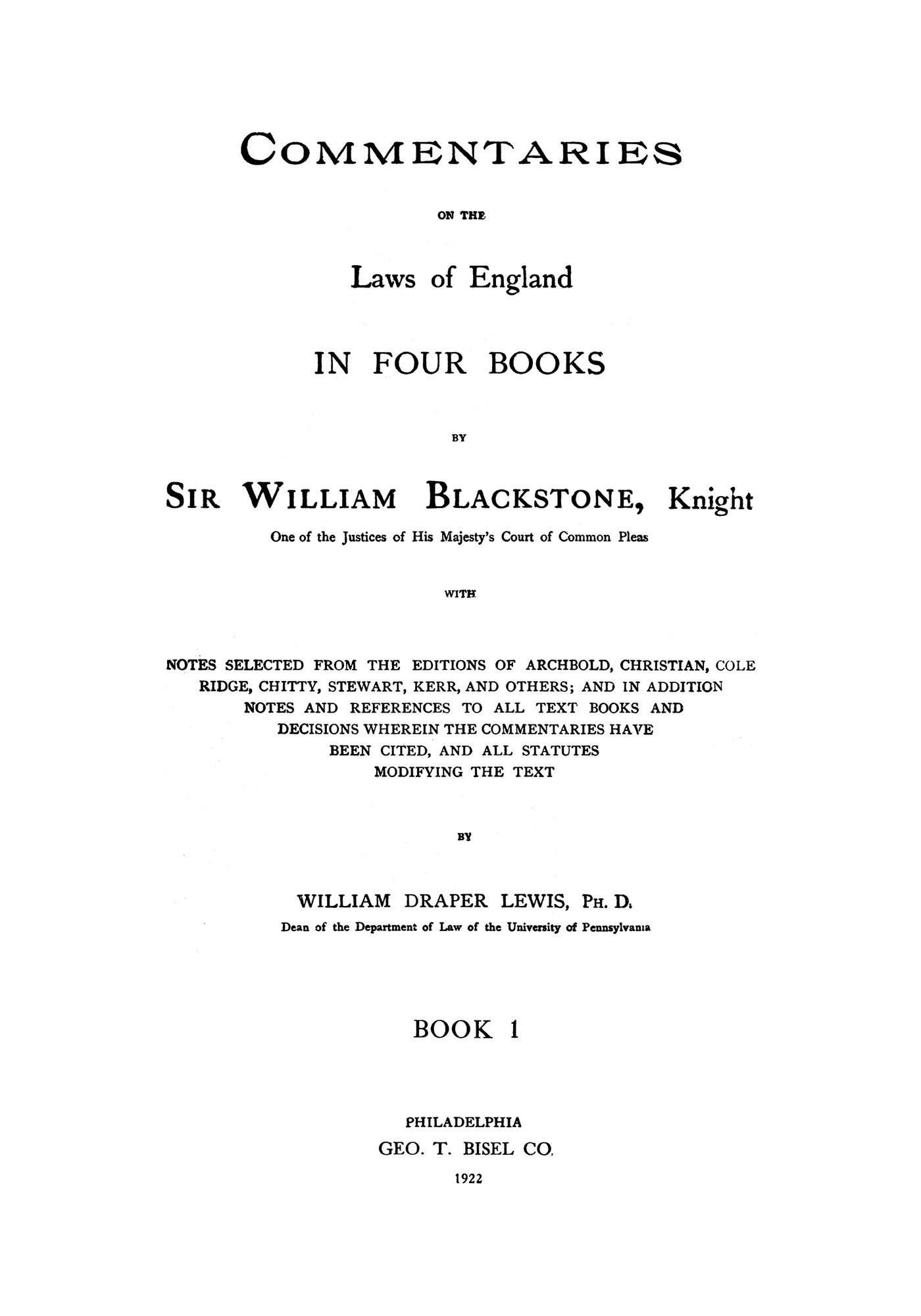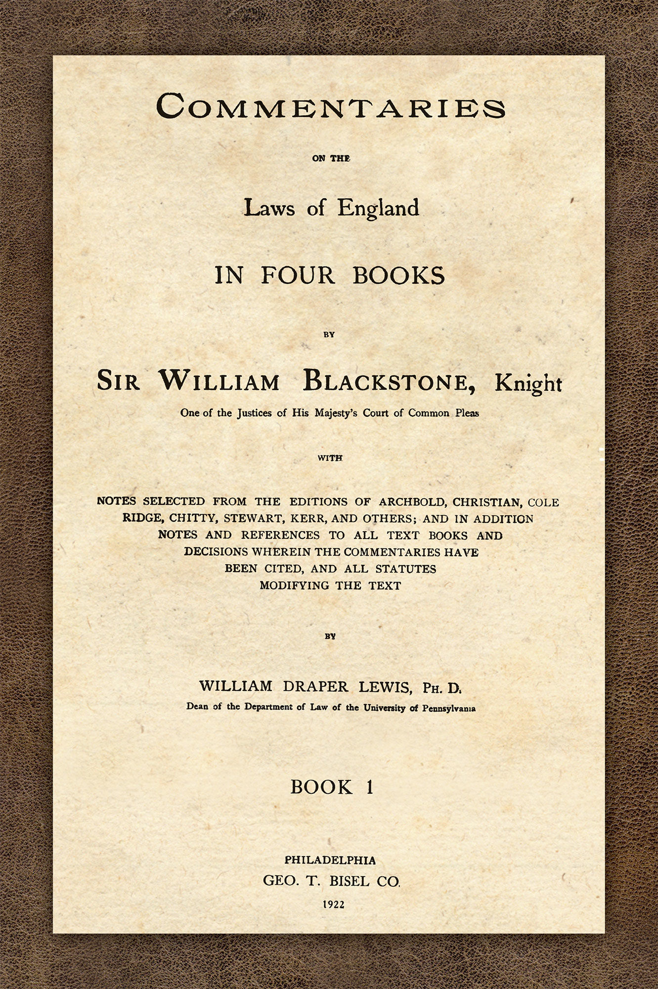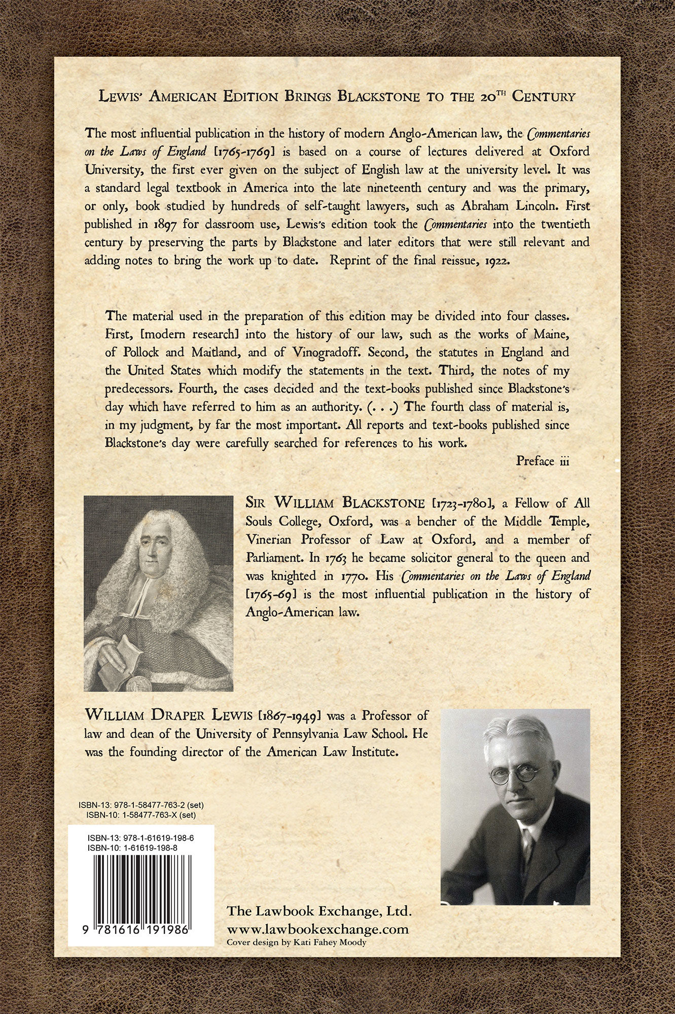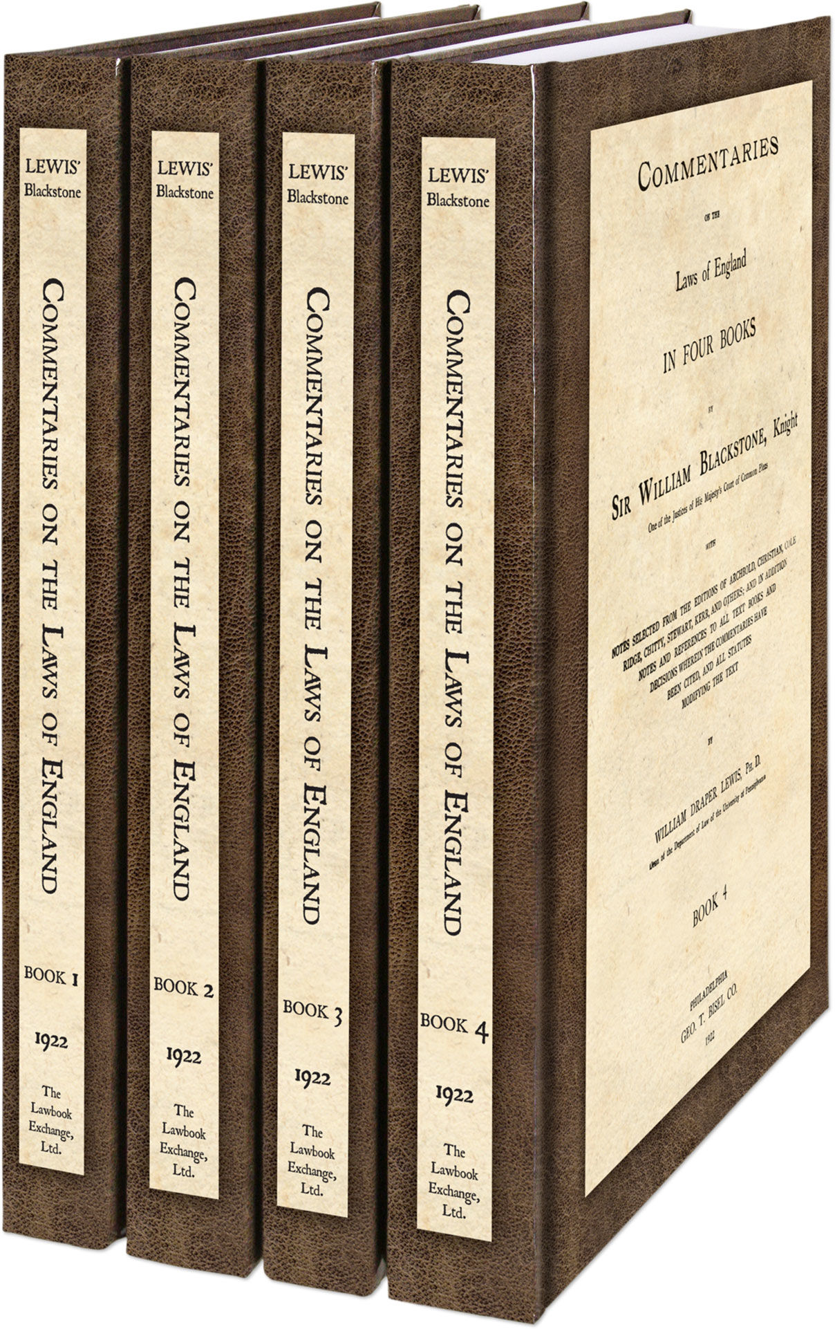 2011. ISBN-13: 9781584777632; ISBN-10:158477763X. Interesting Scholarly Edition of Blackstone Blackstone, Sir William [1723-1780]. Lewis, William Draper, Editor. Commentaries on the Laws of England in Four Books, With Notes Selected from the Editions of Archibold, Christian, Cole, Ridge, Chitty, Stewart, Kerr, And Others; And in Addition Notes and References To All Text Books and Decisions Wherein the Commentaries Have Cited and All the Statutes Modifying the Text. Originally published: Philadelphia: Geo. T. Bisel Co., 1922. 4 Volumes. xxx, star-paged 485, 532, 428, 649 pp. Reprinted 2007, 2011 by The Lawbook Exchange, Ltd. ISBN-13: 9781584777632; ISBN-10: 158477763X. Hardcover. New. $195. * Reprint of the final reissue of Lewis's edition, first published in 1897. It contains the text of the 1778 Oxford edition, the last edited by Blackstone, but omits the appendices to Books 3 and 4. "The material used in the preparation of this edition may be divided into four classes. First, [modern research] into the history of our law, such as the works of Maine, of Pollock and Maitland, and of Vinogradoff. Second, the statutes in England and the United States which modify the statements in the text. Third, the notes of my predecessors. Fourth, the cases decided and the text-books published since Blackstone's day which have referred to him as an authority. (...) The fourth class of material is, in my judgment, by far the most important. All reports and text-books published since Blackstone's day were carefully searched for references to his work.": Preface iii. Laeuchli, A Bibliographical Catalog of William Blackstone 270.