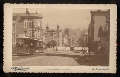 San Francisco: A. J. McDonald. Near fine. Cabinet card [8 1/2" x 5 1/4"]. Tan A. J. McDonald mount with decoratively impressed borders. C. Beach Bookseller and Stationer backstamp. An image of California Street with trolleys in the foreground.