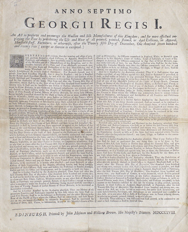Edinburgh: John Mosman and William Brown, 1728. Public General Acts. 1721. 7 Geo.I.c.7. Printed broadside, text in two columns. Folio. Old folds, affixed to stop on verso of left margin. Public General Acts. 1721. 7 Geo.I.c.7. Printed broadside, text in two columns. Folio. The 1728 Edinburgh printing of a 1722 act to promote the manufacture of wool by prohibiting the wearing of printed or dyed cotton or its use in upholstery and window curtains. The penalty for noncompliance was 20 pounds, 15 of which was to be remitted to the local parish for care of the poor. ESTC T21946 (4 copies); Kress, s.3244
