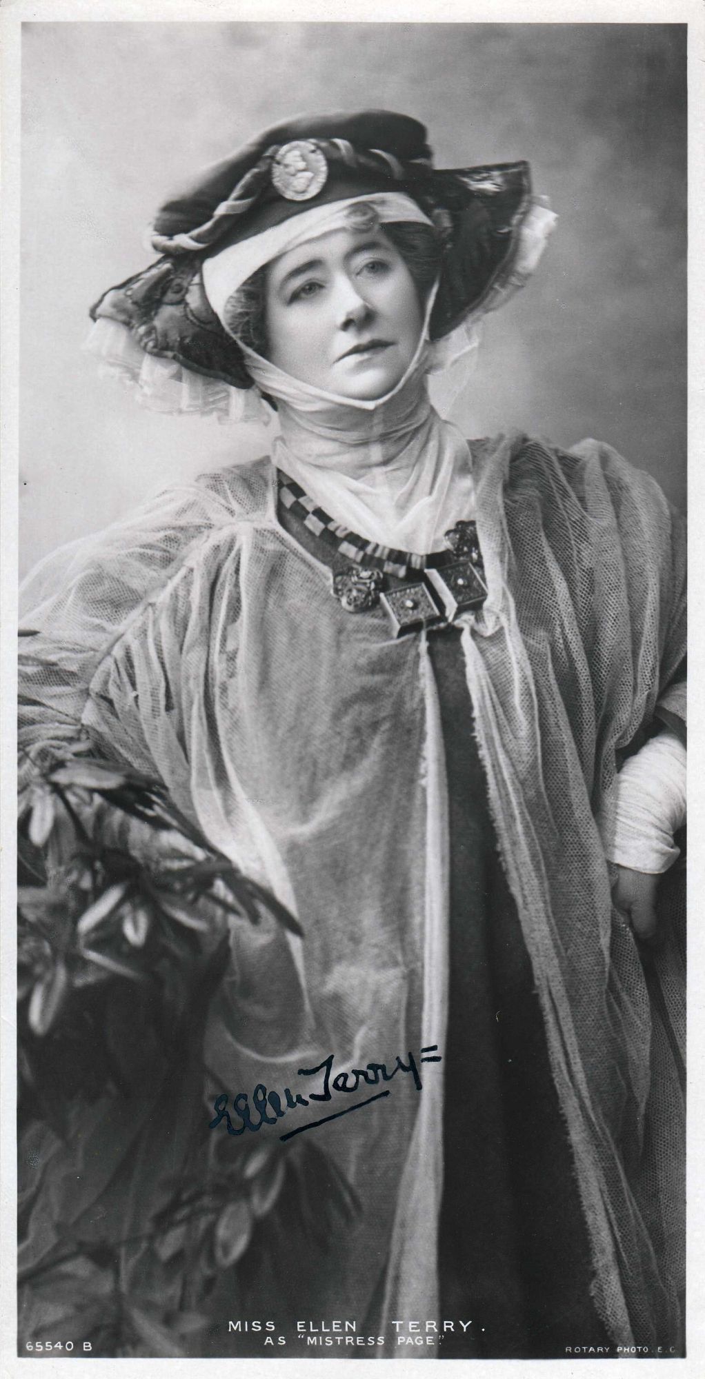 England. Fine. This is a Large print copy by Rotary Photo of the original 1902 photograph by Windsor and Grove of famed actress Ellen Terry as Mistress Page in The Merry Wives of Windsor. It is boldly signed by her. In fine condition. 5 1/4 x 10 1/2 inches. AUTO/022916.