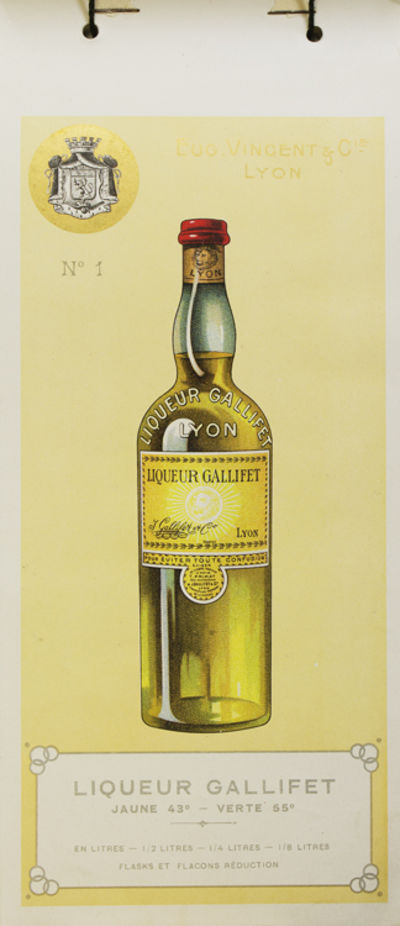 [Lyon: Imprimerie Gougenheim Frères, 1907. 30 numbered chromolithograph plates. Thin oblong 8vo (9-3/4 x 4-1/4 in.). Printed gray wrappers, stapled and with hole punches and string, gold foil stamped arms on front cover. Light wear to covers. With the distribution stamp of Albert Martin, 6 Rue des Tonneliers, Marseille. 30 numbered chromolithograph plates. Thin oblong 8vo (9-3/4 x 4-1/4 in.). A finely printed trade catalogue illustrating the liqueurs and brandies offered by the Lyon wine distributors Eugéne Vincent & Cie, including Crème de Cacoa-chouva, various brands of curaçao and triple sec, anisette, fruit brandies, Peronneau absinthe, and Grog Americain (a bottled punch).