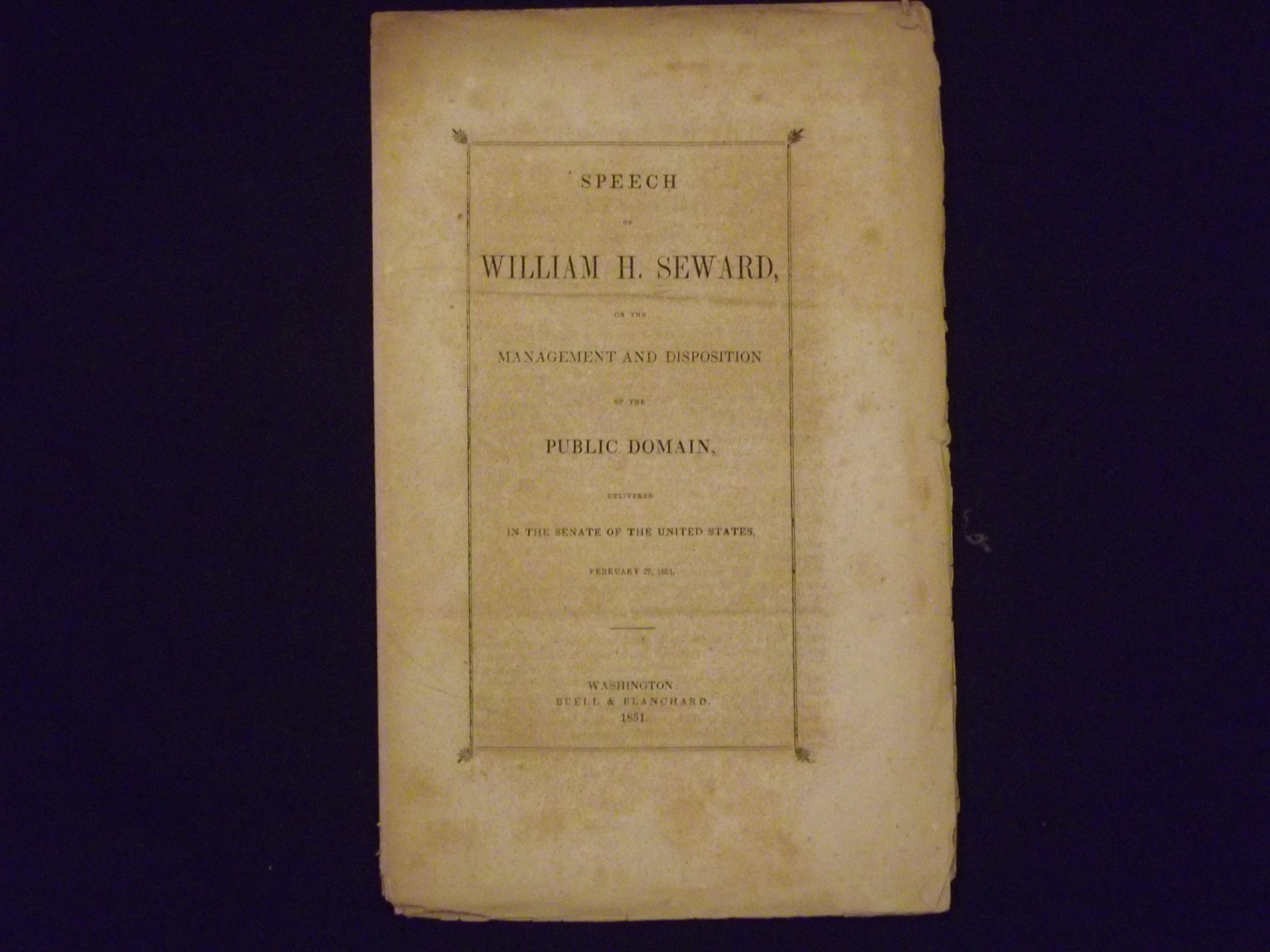 8vo, pamphlet, partially uncut, 15 pp. A good deal of foxing, some darkening, some edge chips and corner folds, otherwise good. William Seward served as Secretary of State under Presidents Lincoln and Johnson, during the critical Civil War period. He was also a U.S. Senator, and Governor of New York. In this speech Seward discuss the merits of disposing of lands held by the Federal government. He also addresses the process of how this should be done, which included giving some lands back to the individual states, and promoting agriculture.