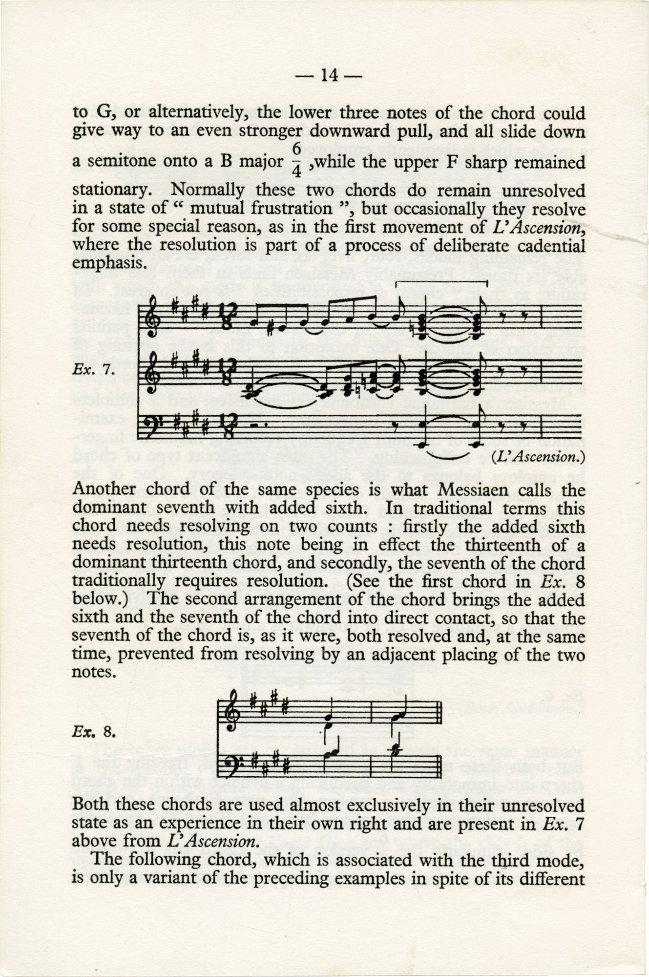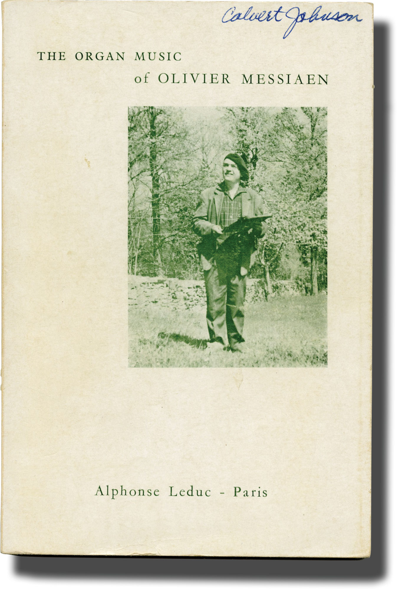 Paris: Alphonse Leduc, 1968. First printing of this edition, and first edition in English. A brief but intense study of Messiaen's organ music, aimed at an advanced audience, with illustrations of staves throughout.
