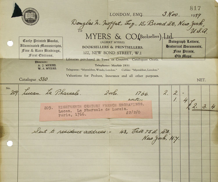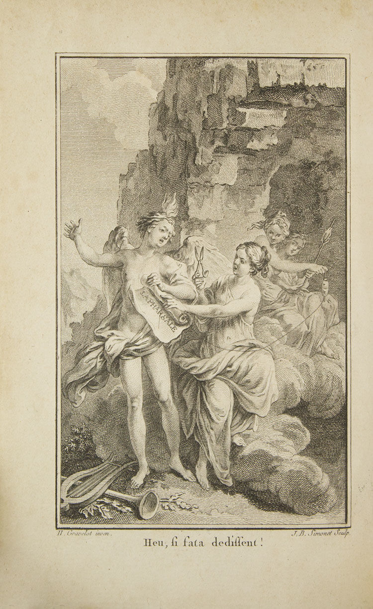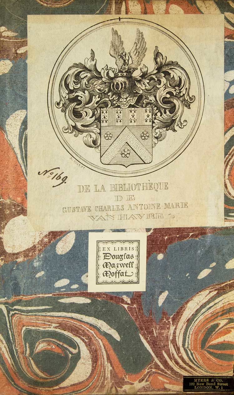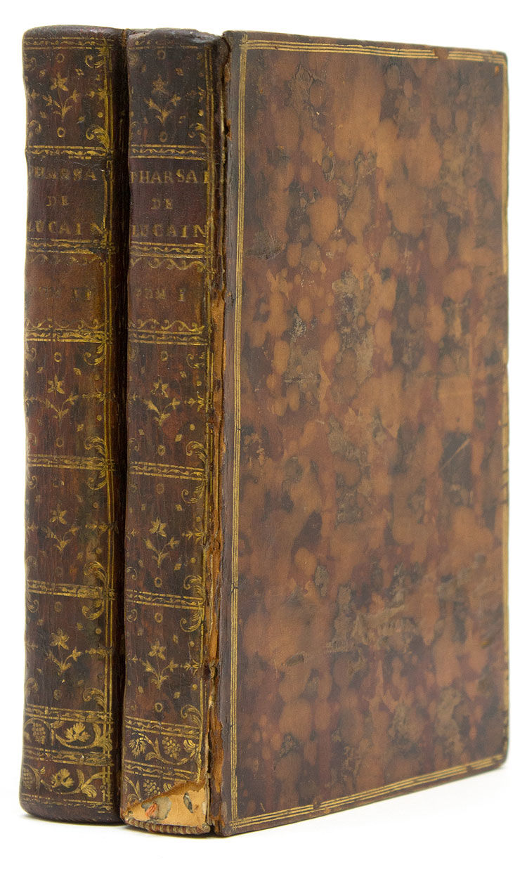 Paris: Chez Merlin, Librairie, rue de la Harpe, 1766. Frontis., [1] f., lxxix, [i] 304 pp., [1 ,errata] ; 5 plates. II: 8vo (19.5 cm, 7.75"). [1] f., 315, [1] pp., [2] ff.; 5 plts. 2 vols. 8vo. Contemporary mottled French calf, marbled edges. Bookplate of Gustave Charles Antoine Maruie van Havre and small booklabel of Douglas Maxwell Moffat (1881-1956). Sales receipt from Myers & Co, London ,1939. Pretty copy. Frontis., [1] f., lxxix, [i] 304 pp., [1 ,errata] ; 5 plates. II: 8vo (19.5 cm, 7.75"). [1] f., 315, [1] pp., [2] ff.; 5 plts. 2 vols. 8vo. The Pharsalia (also known as De Bello Civili "On the Civil War" ) is a great Roman epic poem by the poet Lucan [Marcus Annaeus Lucanus (November 3, 39 CE - April 30, 65 CE] iwhich tells of the civil war between Julius Caesar and Pompey and The Battle of Pharsalia (48 BC). Cohen & DeRicci 662