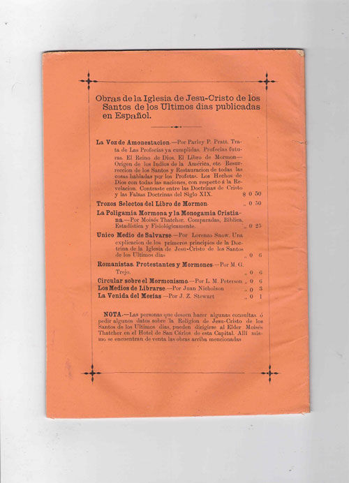 Mexico: Imprenta De E. D. Orozco Y. Compania, 1881. As new. 40pp. Octavo [22 cm] Original orange wrappers with the title printed on the front panel. The rear panel is a list of LDS tracts in Spanish that are available. In exceptional condition. Near fine. Title translates to 'Mormon Polygamy and Christian Monogamy Compared.' Early LDS Spanish tract that is Thatcher's defense of the Mormon practice of plural marriage. This is one of the few printed works by Moses Thatcher, who was the first mission president in Mexico. We can locate five institutional copies. Rare. Flake/Draper 8886.