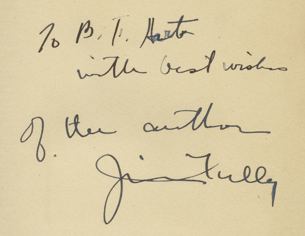New York: Harcourt, Brace, 1922. First Edition. First Edition. INSCRIBED by the author on the front endpaper: "To B.T. Harts / with best wishes of the author / Jim Tully." With Tully's homemade "address label" on the front pastedown, with Tully's name and address in manuscript black ink, in his hand.
