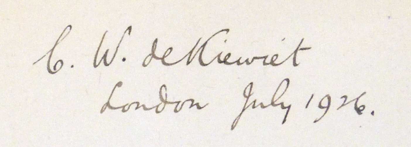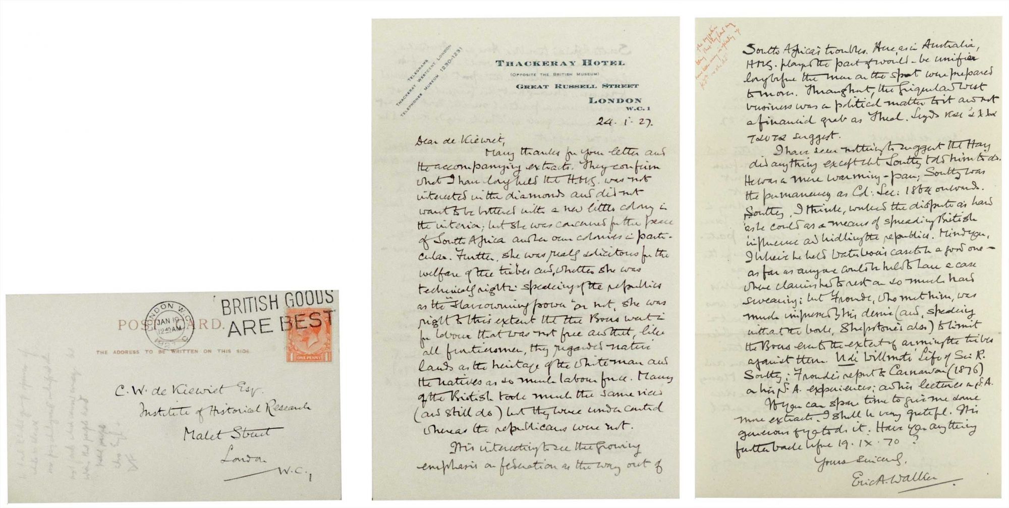 London: Constable & Company, Ltd, 1925. Hardcover. Very Good. Hardcover. First Edition. With laid-in two page letter and postcard from Walker to Cornelis Willem de Kiewiet, and with de Kiewiet's ownership signature on the free front endpaper. Eric Anderson Walker (September 1886 – February 1976) was King George V Professor of History at the University of Cape Town and Vere Harmsworth Professor of Imperial and Naval History at the University of Cambridge. He was a pioneer in writing the history of South Africa and later an important historian of the British Empire, though by the end of his life his work was seen as dated and Eurocentric. Cornelis Willem de Kiewiet (May1902 – February 1986) was a 20th-century historian most notable for having served as president of Cornell University and the University of Rochester. De Kiewiet was born in the Netherlands, but grew up in South Africa, where his father went as a diamond and gold-seeker and later worked as an employee of the Transvaal Republic's Railway. In the early 1920s, Cornelis earned his bachelor's and master's degrees in history from the University of Witwatersrand in Johannesburg, and, in 1927, he earned his Ph.D. in History from the University of London. The inserted correspondence from Walker to de Kiewiet was written in 1927, while de Kiewiet was working on his Ph.d. The texts discuss South African history during and after the Boer War, and such figures as Southey and Froude. They do not pertain to this work directly.