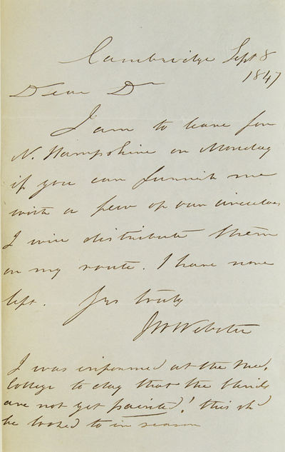 Boston: Charles C. Little and James Brown, 1850. Illus. 628 pp. 1 vols. Thick 8vo. Spine perished, original boards. Illus. 628 pp. 1 vols. Thick 8vo. With ALS from Webster dated Sept 8, 1847 to Dr. Walter Channing of Tremont Stn Boston who was the first Professor of Obstetrics and Medical Jurisprudence at Harvard College asking if he can furnish van (?) circulars to distribution his way to N.H.