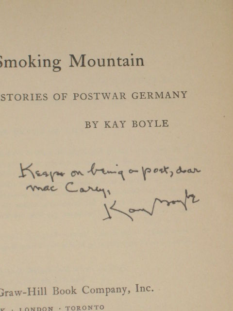 New York: McGraw-Hill Book Co., Inc, 1951. First Edition. Hard Cover with Dust Jacket. Very Good/Very Good. Octavo. SIGNED AND INSCRIBED "KEEP ON BEING A POET, DEAR MAC CAREY" BY KAY BOYLE to actor Macdonald Carey on the title page, 273pp. Bound in gray cloth, spine lettering white; a very good copy in a very good dust jacket; bookplate to front free endpaper of William Morris Agency, Inc. of Beverly Hills. In unclipped, dust jacket, with small loss at spine ends.
