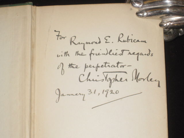 New York: Doubleday, Page & Co, 1919. Hard Cover. Very Good. 12mo. SIGNED, INSCRIBED TO RAYMOND E. RUBICAM AND DATED BY CHRISTOPHER MORLEY ON FFEP. Raymond E. Rubicam was an American advertising pioneer who co-established the Young & Rubicam Advertising Co., 190pp., bound in 1/4 green cloth over gray paper covered boards lettered in dark green, spine gilt; light wear to extremities. A very good copy.