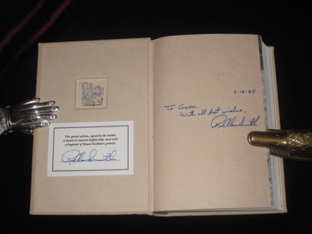 New York: Abbeville Press, 1985. SPECIAL DELUXE EDITION. Full-Leather. Fine. Octavo. SPECIAL DELUXE EDITION, 415 pages, bound in full beige BUFFALO HIDE, and SIGNED on an official bookplate on the front pastedown AND a slice of Mt. Rushmore granite mounted within a recessed compartment built into the front pastedown; ADDITIONALLY INSCRIBED by the author on the front free endpaper, signed and dated, A lovely and interesting book illustrated with many fascinating photographs of the miners who drilled and carved the hard granite. A fine copy without glassine jacket.