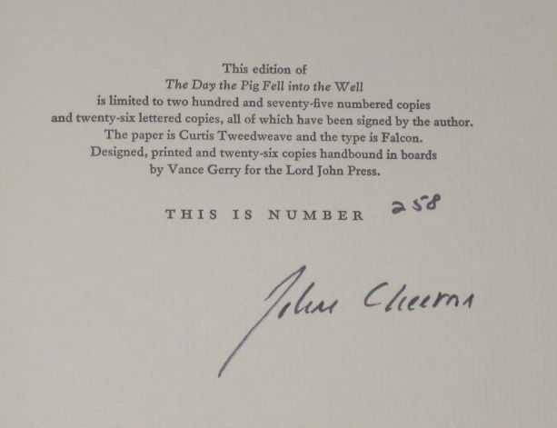 Northridge: Lord John Press, 1978. First Edition. Hard Cover. Fine. SIGNED BY JOHN CHEEVER ON COLOPHON without personalization. LIMITED EDITION OF 275 SIGNED AND NUMBERED COPIES. THIS IS No. 258. Issued without dust jacket. Small quarto; gold cloth spine, with paper label, over decorated tan boards.