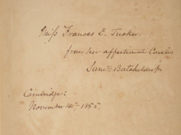 Cambridge: Riverside Press, 1858. First Edition. Hard Cover. Very Good. Octavo. SIGNED AND INSCRIBED BY SAMUEL BATCHELDER AND DATED November 4, 1866; original brown cloth, stamped in gilt and blind; 72 pages. Additionally, the author has printed his name on the contents page, to show authorship of a poem. Light browning to end papers, light age-toning to text; binding with slight fading at edges; overall, very good.