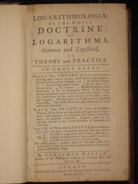 London; (1740, 1739): For J. Hodges. Full-Leather. Very Good. Octavo. In three parts. xii, [1]246, (2)pp. publisher's ads; title page dated 1739 for the table or canon, 62(1), (1)pp. publisher's ad. (The last part has a separate title page, pagination and register, reading "Logarithmology." Part II. Containing a threefold table or canon of logarithms). Bound in contemporary blind stamped calf, early rebacking, circular paper spine label with manuscript title faded. Renewed endpapers with cloth tape reinforcement at hinges. Lacking the folding plate at page 114. In all, a very good copy. Internally clean.