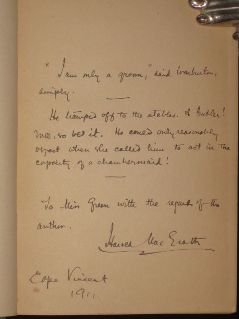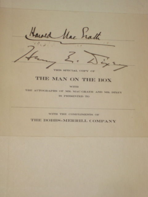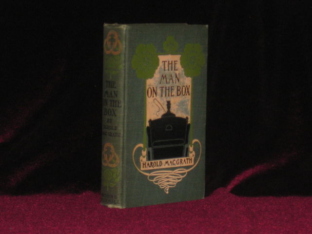 Indianapolis: The Bobbs-Merrill Co, 1904. First Edition. Hard Cover. Very Good. Octavo. SIGNED BY HAROLD MACGRATH AND MR. DIXEY ON PRESENTATION BOOKPLATE without personalization. WITH A LEAF OF MANUSCRIPT QUOTES tipped in. 361pp., (7)pp. publisher's ads at rear. Illustrated by Harrison Fisher. Bound in pictorial green cloth depicting a man in a carriage in black with decorations in light green and peach, decorative spine; covers lightly rubbed with minor wear to spine ends. Publisher's presentation plate to front pastedown "This special copy of The Man on the Box with the autographs of Mr. MacGrath and Mr. Dixey is presented to__________ with compliments of the Bobbs-Merrill Company." Also, there is a leaf of manuscript tipped in after half-title SIGNED Harold MacGrath/ Cape Vincent/ 1911. Two quotes from the text are written theron: "I am only a groom," said Warburton, simply. (from p. 324). [and] "He tramped off to the stables. A butler! Well, so be it. He could only reasonably object when she called him to act in the capacity of a chambermaid!" (from p. 164). A very good copy.