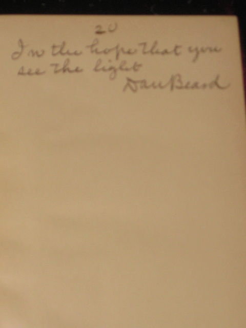 New York: Charles L. Webster, 1892. First Edition. Hard Cover. Very Good+. SIGNED AND INSCRIBED "IN THE HOPE THAT YOU SEE THE LIGHT" BY DAN BEARD ON FEP. Beard is the co-founder of the Boy Scouts. Octavo, original green pictorial cloth; upper fore-corner of FEP with small loss; very light wear at extremities; small University of Virginia Library label on rear pastedown; a very good+ copy.