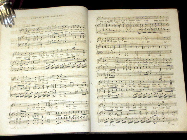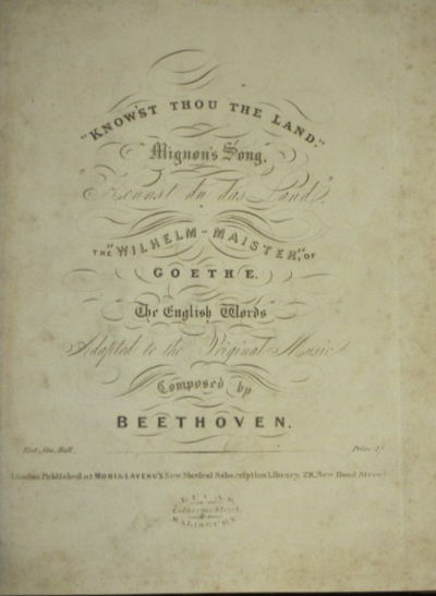 London, Nd. (ca.1830): VARIOUS. Hard Cover. Very Good. Small Folio. A collection of 24 German songs and music by various composers; Beethoven, Schubert, Sphr, Thalberg, etc. Translated and engraved for English use. All bound in contemporary 3/4 brown calf over marbled paper covered boards, raised bands, red morocco spine label gilt, brown endpapers. Wear to corners, Contemprary name and manuscript list of songs including; Beethoven's "O Tu, La Cui Dolce Possanza," "Aria from the opera of Fidelio," "Know'st Thou the Land," and "Oh What Dreary Gloom." Schubert's "Six Songs" with tape mends to closed tears on numbers 1 & 6, Thomas Moore's "A Canadian Boat Song," etc.and the last song with edge wear. A very nice collection.