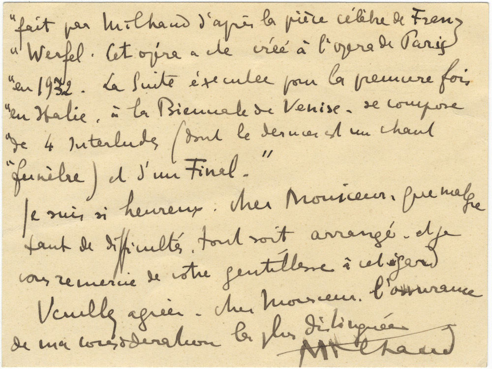 Milhaud writes about an upcoming performance of the Symphonic Suite from his opera Maximilien, probably at the Venice Biennale. He regrets that his correspondent did not order material for it from Universal, but is nonetheless very happy that "in spite of so many difficulties everything is arranged." He includes information about the suite within quotation marks.