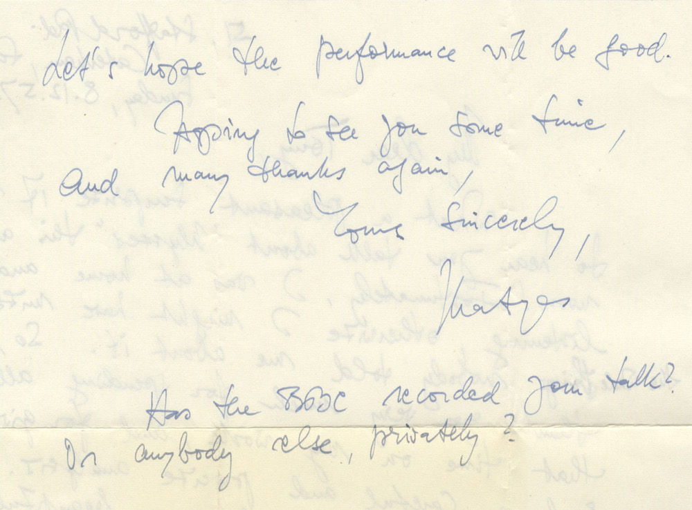 Seiber thanks Hopkins for a thoughtful radio presentation of his choral work Ulysses. He asks if the BBC or anyone else has recorded it. He also asks Hopkins if he will be in Festival Hall on Wednesday.