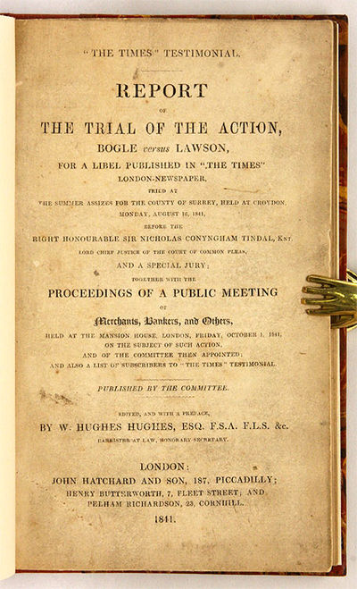 1841. The Times Testimonial. London, 1841. Rare.. The Times Testimonial. London, 1841. Rare. One of the Most Detailed Accounts of a Major Nineteenth-Century Financial Swindle [Trial]. Hughes, W. Hughes, Editor. "The Times" Testimonal: Report of the Trial of the Action, Bogle Versus Lawson, For a Libel Published in "The Times" London-Newspaper, Tried at the Summer Assizes for the Country of Surrey, Held at Croydon, Monday, August 16, 1841, Before the Right Honourable Sir Nicholas Conyngham Tindal, Knt. Lord Chief Justice of the Court of Common Pleas, And a Special Jury; Together with the Proceedings of a Public Meeting of Merchants, Bankers and Others, Held at the Mansion House, London, Friday, October 1, 1841, On the Subject of Such Action, And of the Committee then Appointed; And Also a List of Subscribers to "The Times" Testimonial. Published by the Committee. London: John Hatchard and Son, Henry Butterworth and Pelham Richardson, 1841. 179, [1] pp. Half-title lacking. Octavo (8-1/4" x 5"). Recent quarter cloth over marbled boards, printed paper title label to spine. Some toning to text, light soiling to title page. A very nice copy. $750. * First edition. A sensational case of a million-pound plot to defraud Continental bankers by forged letters of credit, or lettres circulaires, purporting to have been issued by the bankers Glyn, Hallifax, Mills, & Co. The plot was exposed by a Times of London correspondent, in a letter published on 26th May 1840. This case was important because it exposed the largely unregulated banking practices associated with letters of credit, which were easy to forge and difficult to police. The naming of Allan George Bogle-who was almost certainly involved-triggered this libel action against John Joseph Lawson, the printer and publisher of the Times, and resulted in the award of one farthing damages for Bogle, but enormous expense and the considerable gratitude of bankers and investors for the Times. The present report is probably the most detailed account of a major financial swindle of this period, particularly one involving letters of credit. A second edition was published the same year as the first, the third and final edition in 1842. All three are rare. OCLC locates 6 copies worldwide of the first edition, 2 in North America (Newberry Library, Temple University). LibraryHub adds a copy at the Society of Antiquaries. This edition not in Kress.