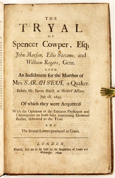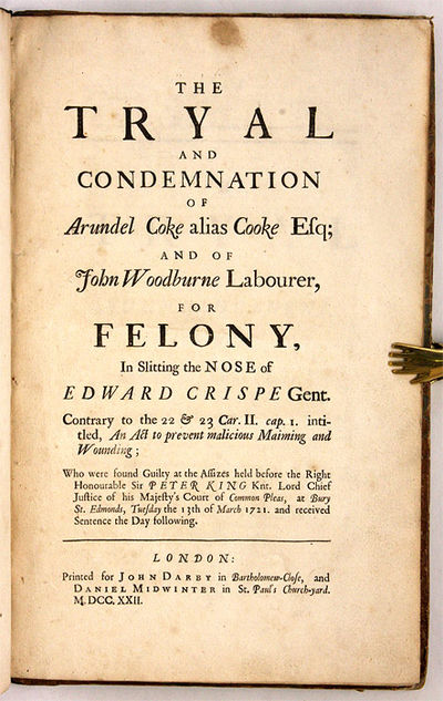 1699. 2 titles, bound together. London, 1722, 1699. 2 titles, bound together. London, 1722, 1699. Scarce English Trials Concerning a Botched Murder Attempt and the Murder of a Quaker Woman [Trials]. Coke, Arundel [d. 1722], Defendant. Woodburne, John, [d. 1722], Defendant. The Tryal and Condemnation of Arundel Coke Alias Cooke Esq; And of John Woodburne Labourer, For Felony, in Slitting the Nose of Edward Crispe Gent. Contrary to the 22 & 23 Car. II. Cap. I. Intitled, An Act to Prevent Malicious Maiming and Wounding; Who Were found Guilty at the Assizes Held Before the Right Honourable Sir Peter King Knt. Lord Chief Justice of his Majesty's Court of Common Pleas, At Bury St. Edmonds, Tuesday the 13th of March 1721. And Received Sentence the Day Following. London: Printed for John Darby in Bartholomew-Close, And Daniel Midwinter in St. Paul's Church-Yard, 1722. 16, *17-*18, 17-37, [1] pp. With an initial imprimatur leaf; text is continuous (and complete). [Bound with] Cowper, Spencer [1669-1728], Principal Defendant. The Tryal of Spencer Cowper, Esq; John Marson, Ellis Stevens, And William Rogers, Gent. Upon an Indictment for the Murther of Mrs. Sarah Stout, A Quaker. Before Mr. Baron Hatsell, At Hertford Assizes, July 18, 1699. Of Which They Were Acquitted. With the Opinions of the Eminent Physicians and Chirurgeons on Both Sides Concerning Drowned Bodies, Delivered in the Tryal. And the Several Letters Produced in Court. London: Printed and Are to be Sold by the Booksellers of London and Westminster, 1699. 38 pp. Folio (12-1/2" x 8"). Contemporary marbled boards with expert period-style quarter calf by Philip Dusel, raised bands and lettering piece to spine, endpapers retained, hinges repaired. Moderate rubbing and scuffing to boards, corners bumped and somewhat worn, early armorial bookplate to front pastedown, tiny wormhole through bottom margin of text block. Moderate toning, somewhat heavier in places, some leaves have light foxing or stains. Early owner annotation to front free endpaper, interior otherwise clean. Two scarce trials in a handsome Philip Dusel binding. $1,250. * Coke: first edition; Cowper: only edition, one of three issues from 1699. Coke, a barrister, lost his money in the South Sea Bubble. He hired Woodburn to kill his brother-in-law, Edward Crisp, aiming to inherit his money. In his failed murder attempt Woodburn managed to cut Edward Crisp's nose. This led to the firs.