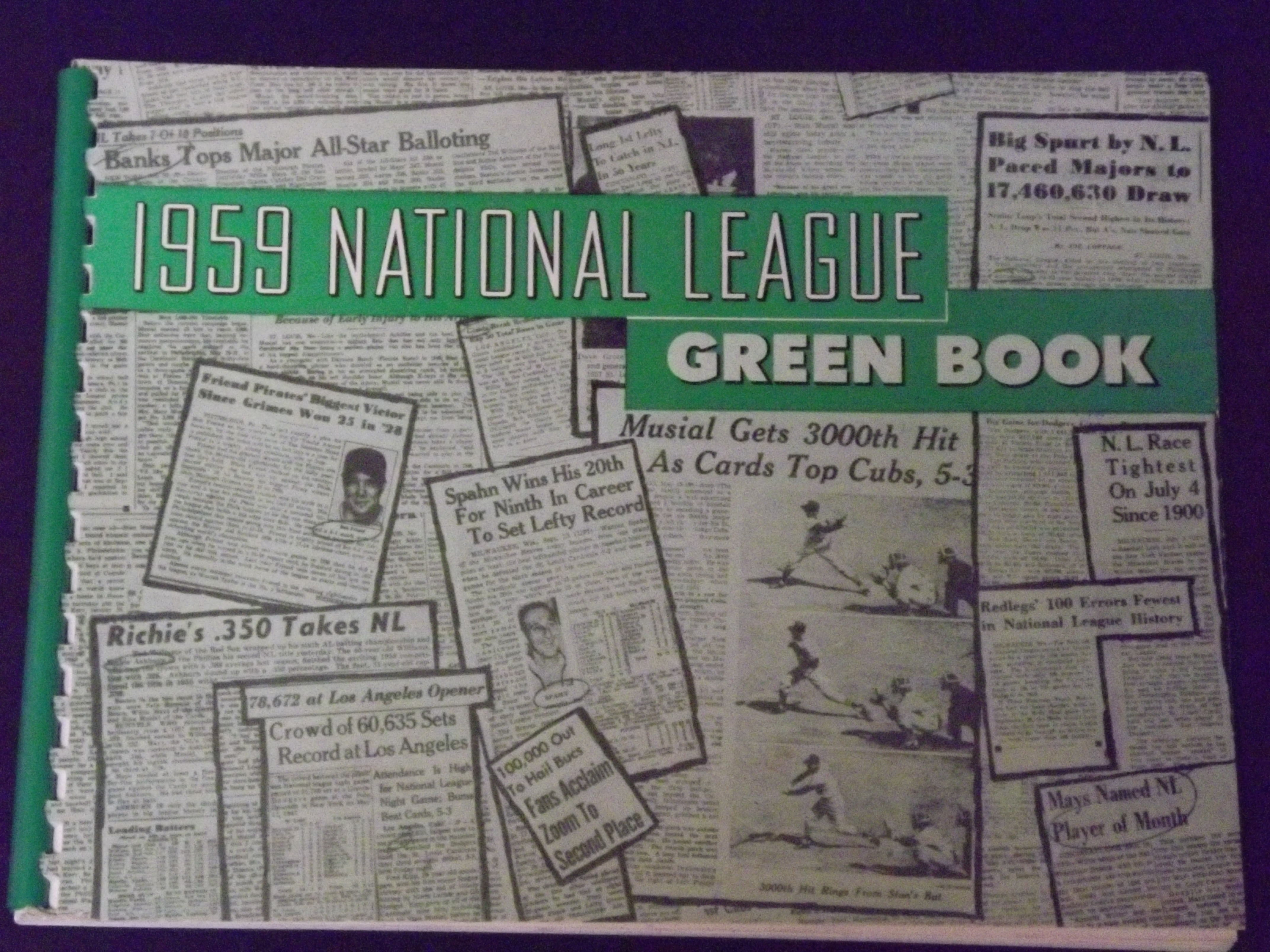 4to, (11 1/4" x 8 1/2"), spiral bound, green covers with illustration, 60 pp. Some slight edge wear, small stain on page 24, very slight aging; overall near fine. Beginning in the 1930s major league baseball (MLB) printed its red and green books to serve as a research tool for the media, The Green Book was edited by Dave Grote, and its full of information about the National League teams, including game rules, official game schedules, spring training information and club standings. There is also substantial information on the players, such as, batting averages, lifetime pitching records, grand slam home runs, and MVP awards. While the Red and Green books were eventually sold to fans for a time, in 2009 they stopped printing them and sent digital versions to the press. AP February 26, 2009.