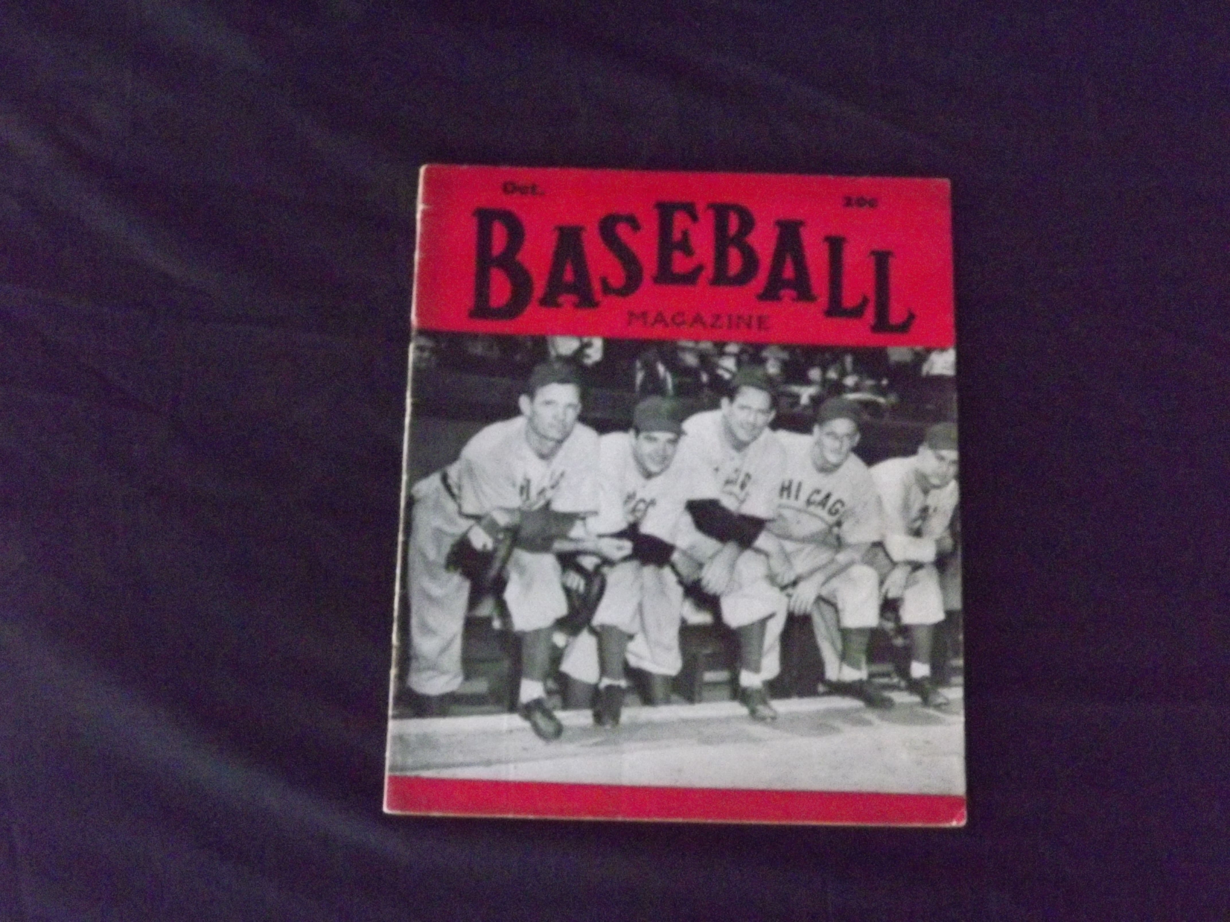 4to, magazine, glossy covers, illustrated, 361-396 pp. Mostly margin tear in lower right side of magazine, mostly in first ten pages, but extends beyond that, does not really affect text, small tape repair to back of front cover, normal aging; otherwise about very good. Baseball Magazine was published for almost 50years, ending in the late 1950s. This copy was probably the first published after the official end of WWII. An editorial in this edition talks about post war plans by some teams to improve their stadiums. This would include the New York Yankees. The cover photograph features the Chicago Clubs' pitching staff. Articles in this issue include "The Road Ahead" about what the end of the war will mean for baseball, and another article on the value of players doing time in the minors.