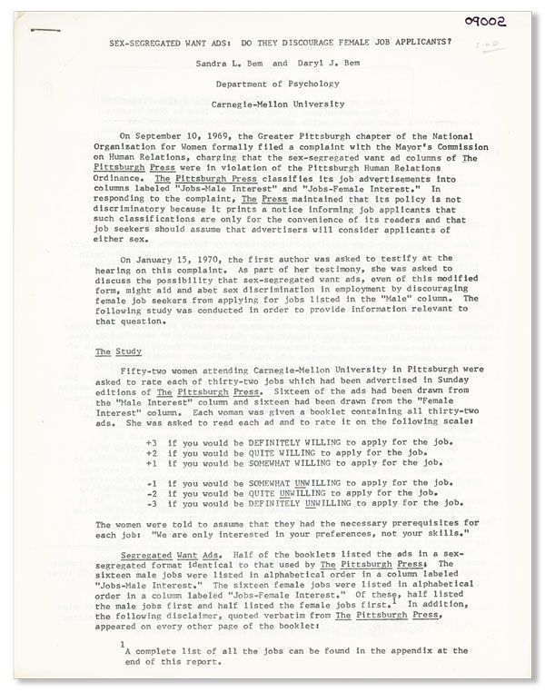 [Pittsburgh: Know, Inc, n.d., ca. 1970]. First Edition. Quarto (27.75cm.); two typescript leaves staplebound at top left-hand corner. About Fine. Study conducted at Carnegie-Mellon on sex-segregated wants ads as published by The Pittsburgh Press. Unlocated in OCLC as of August, 2018.