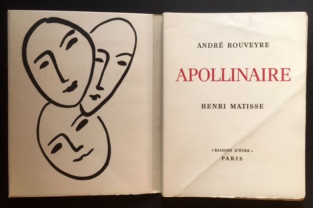 Paris: Raisons D'Etre, 1952. Original wraps. Near Fine. Henri Matisse. Sumptuous 1952 biography of the poet Apollinaire, beautifully illustrated by Henri Matisse. #268 of only 380 copies issued which include 8 original Matisse lithos (2 as the front and rear card wrappers and the other 6 within the text). Bright, well-preserved and VG+, with light foxing to the panels and light creasing at the first several leaves (mildly affecting the title page and the first lithograph). Folio, unbound signatures as issued. The Matisse lithographs once again printed by the great French firm Mourlot Freres. A lovely title issued by Raison D'Etre of Paris.