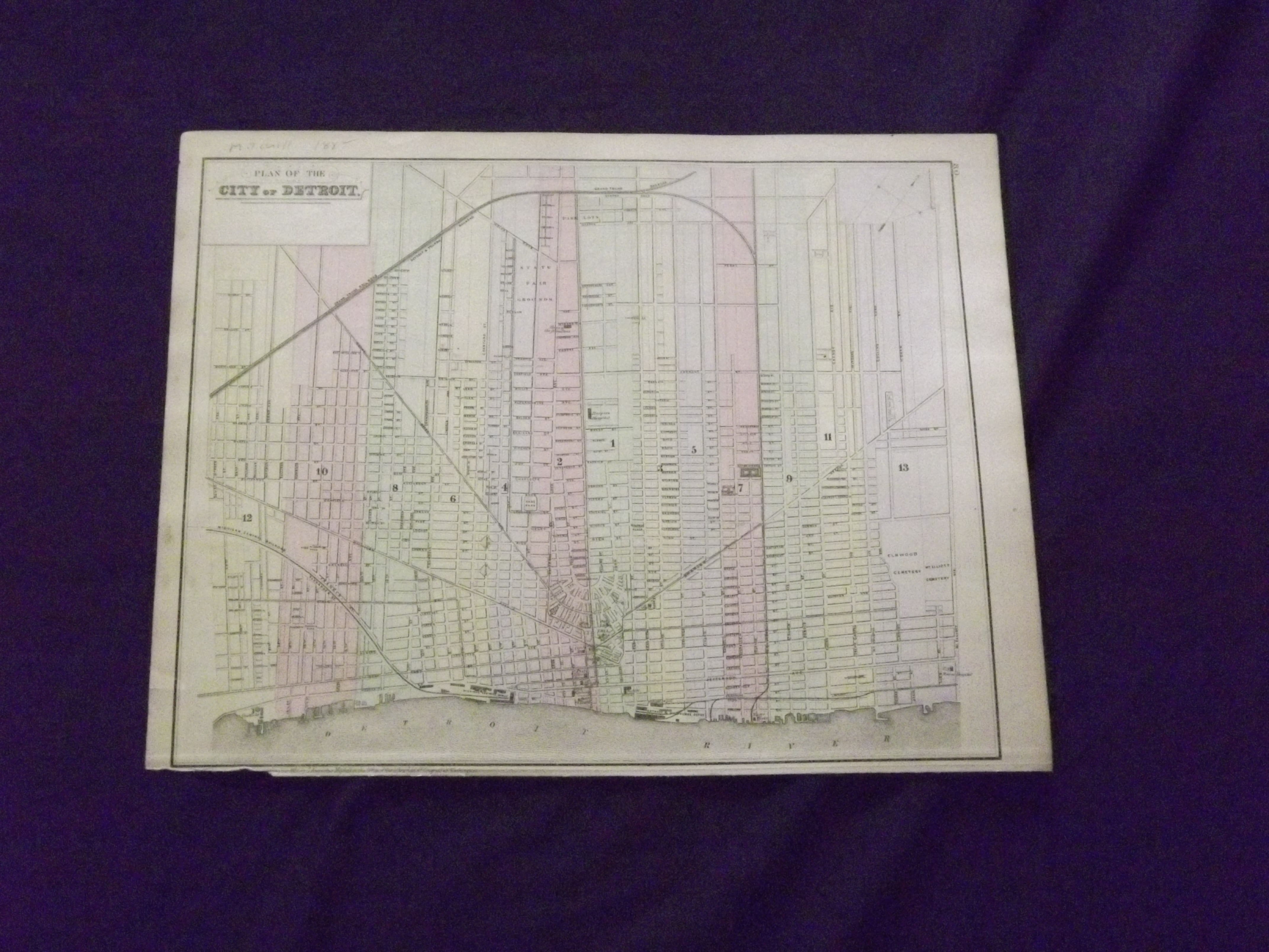 Unbound, colored engraved map, 12" x 15". Bottom margin narrow, and chip has removed some of the copyright information, but below neat line, a little darkening and aging; Slight toning and aging; otherwise about very good. Maps are wrapped with acid free board, or in rigid sleeves. The Mitchell family started to produce atlases in 1846, and continued into the early 1890s. Around 1860, S. Augustus Mitchell Jr. took over, and the atlas would be called Mitchell's New General Atlas. This is an attractive single page map of the City of Detroit from the 1882 installment of this atlas. Stand-alone maps of Detroit are not that common in the Mitchell atlas series. Ristow 311-313. Phillips 907.