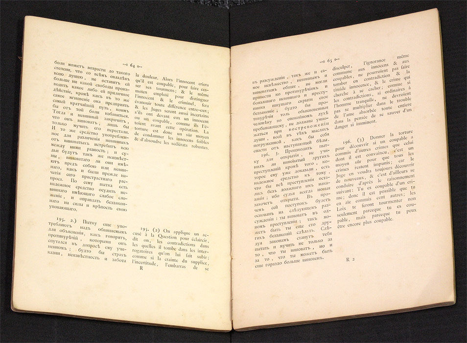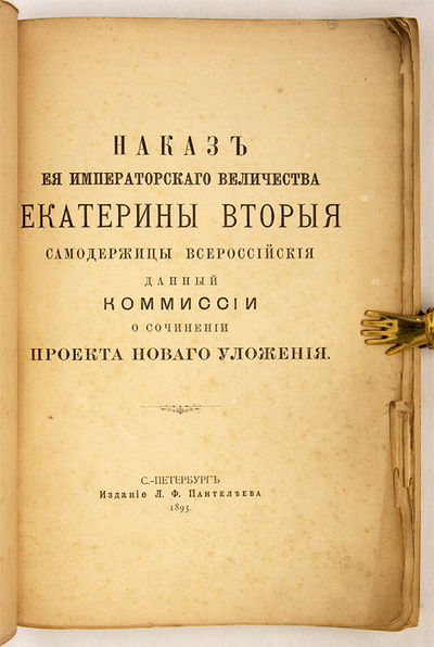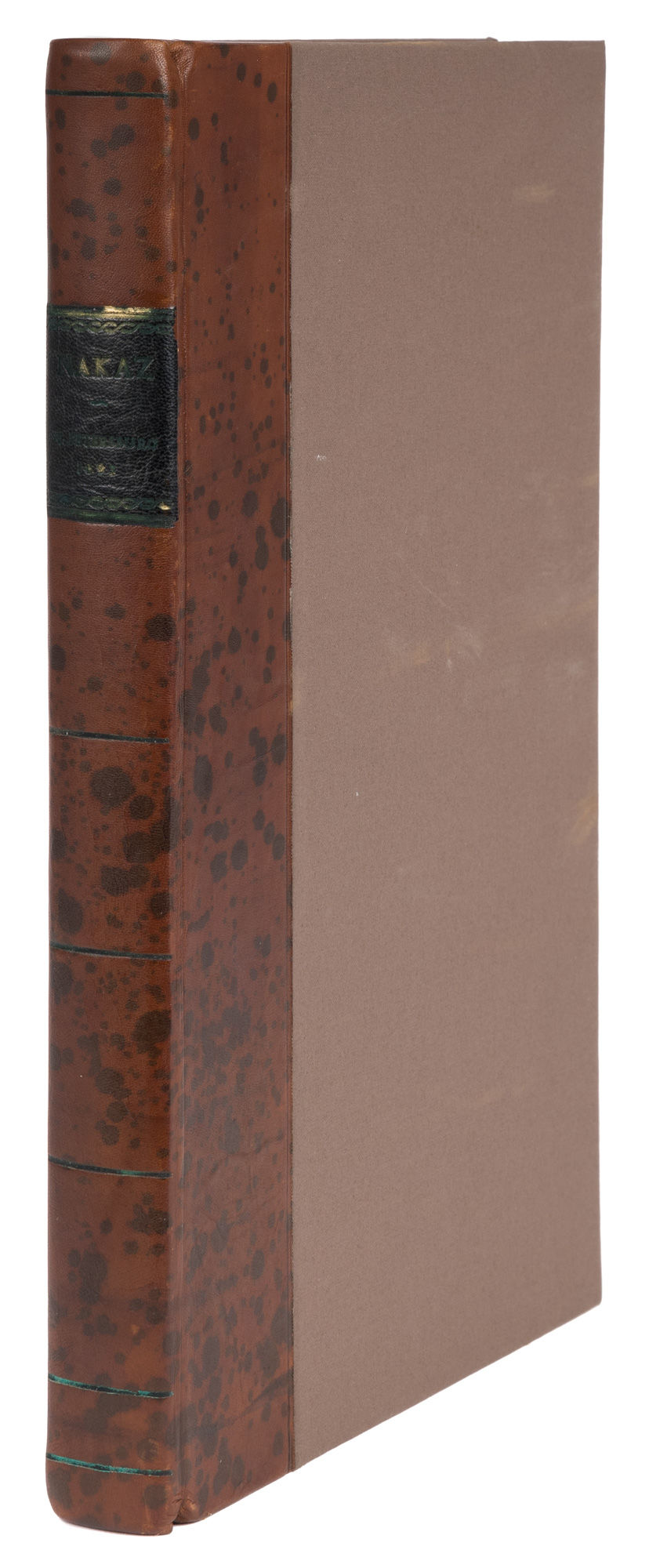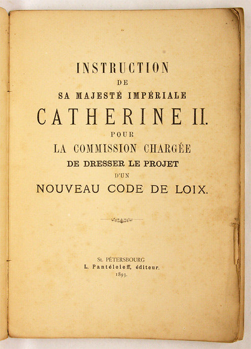 1893. St. Petersburg: Izd. L.F. Pantelieeva, 1893. St. Petersburg: Izd. L.F. Pantelieeva, 1893. The Last Edition of the Nakaz Published in the Nineteenth Century Catherine II [1762-1796], Empress of Russia. Bezgin, Il'ia Grigor'evich, Editor. Nakaz Eja Imperatorskago Velicestva Ekateriny Vtoryja Samoderzicy Vserossijskija Dannyj Kommissii o Socinenii Proekta Novago Ulozenija. St. Petersburg: Izd. L.F. Pantelieeva, 1893. 53, 201 pp. Text of Nakaz in Russian with parallel French translation. Original printed stiff wrappers bound into recent quarter calf over cloth, gilt fillets and lettering piece to spine, endpapers renewed. Gilding mostly rubbed away from lettering piece, light soiling and edgewear to wrappers, moderate toning to text, faint dampspotting to a few leaves. Small early owner label to front free endpaper, internally clean. $1,750. * The last edition published in the nineteenth century. The Nakaz, or Instruction, is a statement of legal principles written by Catherine II between 1764 and 1766. It was among her most ambitious and significant undertakings. Infused with the ideas of the French Enlightenment, and copied mostly from the work of Voltaire, Montesquieu and Beccaria, it was compiled as a guide for the All- Russia Legislative Commission convened by the Empress in 1767 to create a new code to replace the 1649 Muscovite Code. Revised in consultation with Frederick the Great and Voltaire, the Instruction proclaimed the equality of all men before the law and denounced torture and the death penalty. Unfortunately, her proposed code was never completed. The first two editions, one with parallel texts in Russian and German, were published in 1767. OCLC locates 1 copy in a North American law library (Columbia). Another copy located at Harvard Law School. Butler, The Nakaz of Catherine the Great 526 (Entry 18).
