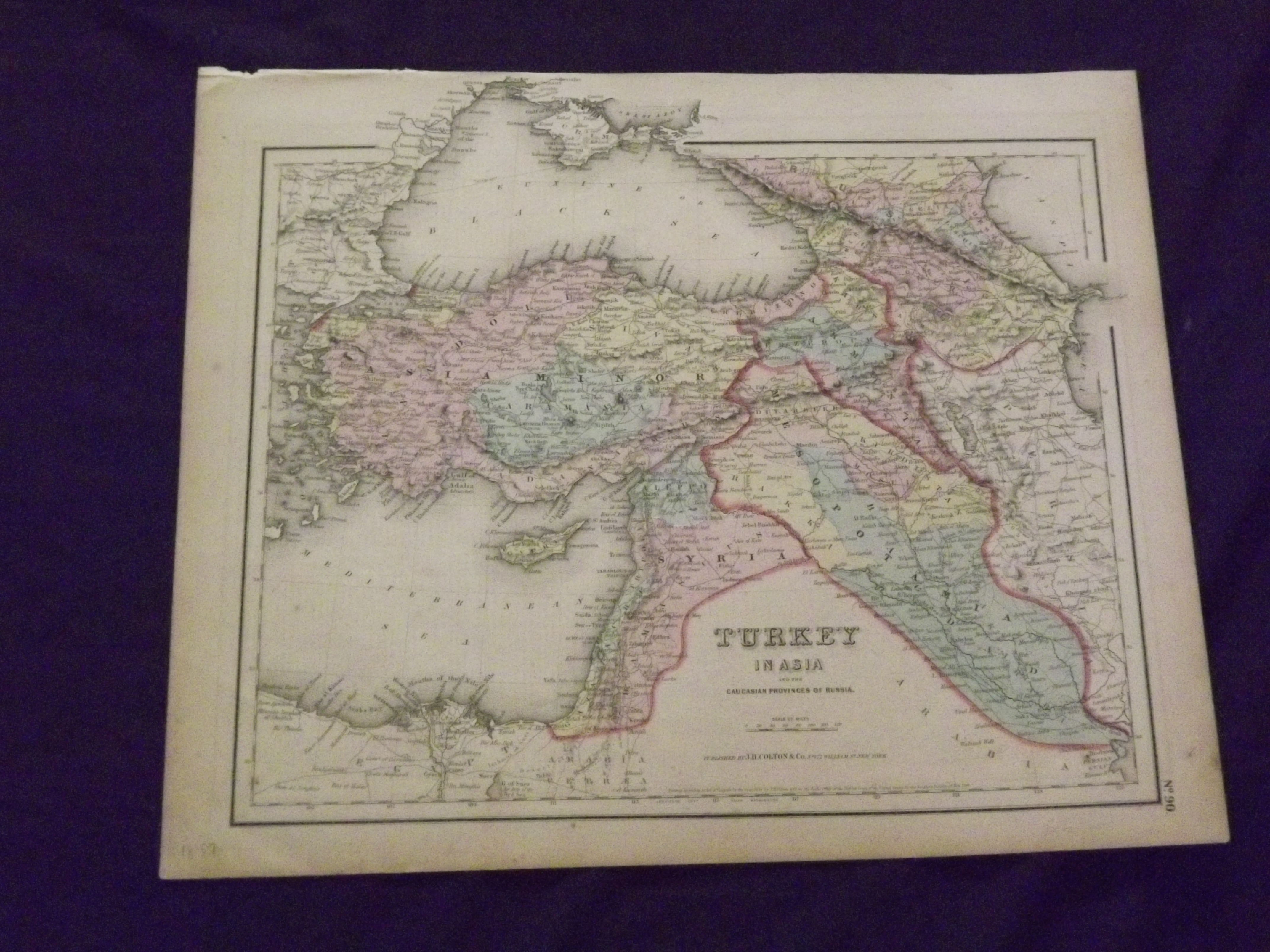 Unbound, colored engraved map, straight-line boarder, 16" x 13". Some browning and aging, some minor foxing, upper margin chip, not affecting anything; overall generally bright and clean and in very good condition. Maps are wrapped with acid free board, or in rigid sleeves. Beginning with J. H. Colton (1800-1893), the Colton family published atlases for over 30 years. Colton's Atlas of the World was first published in 1855 in a large two volume set. In 1857 it became Colton's General Atlas, and Colton's sons, George Woolworth and Charles B. would take over the business. This is a colorful map of Turkey from the 1857 edition of Colton's General Atlas. The map offers good detail on the country, and includes a two small insets showing Candia or Crete, and the Bosphorus Extra postage may be required. Ristow 313-326.
