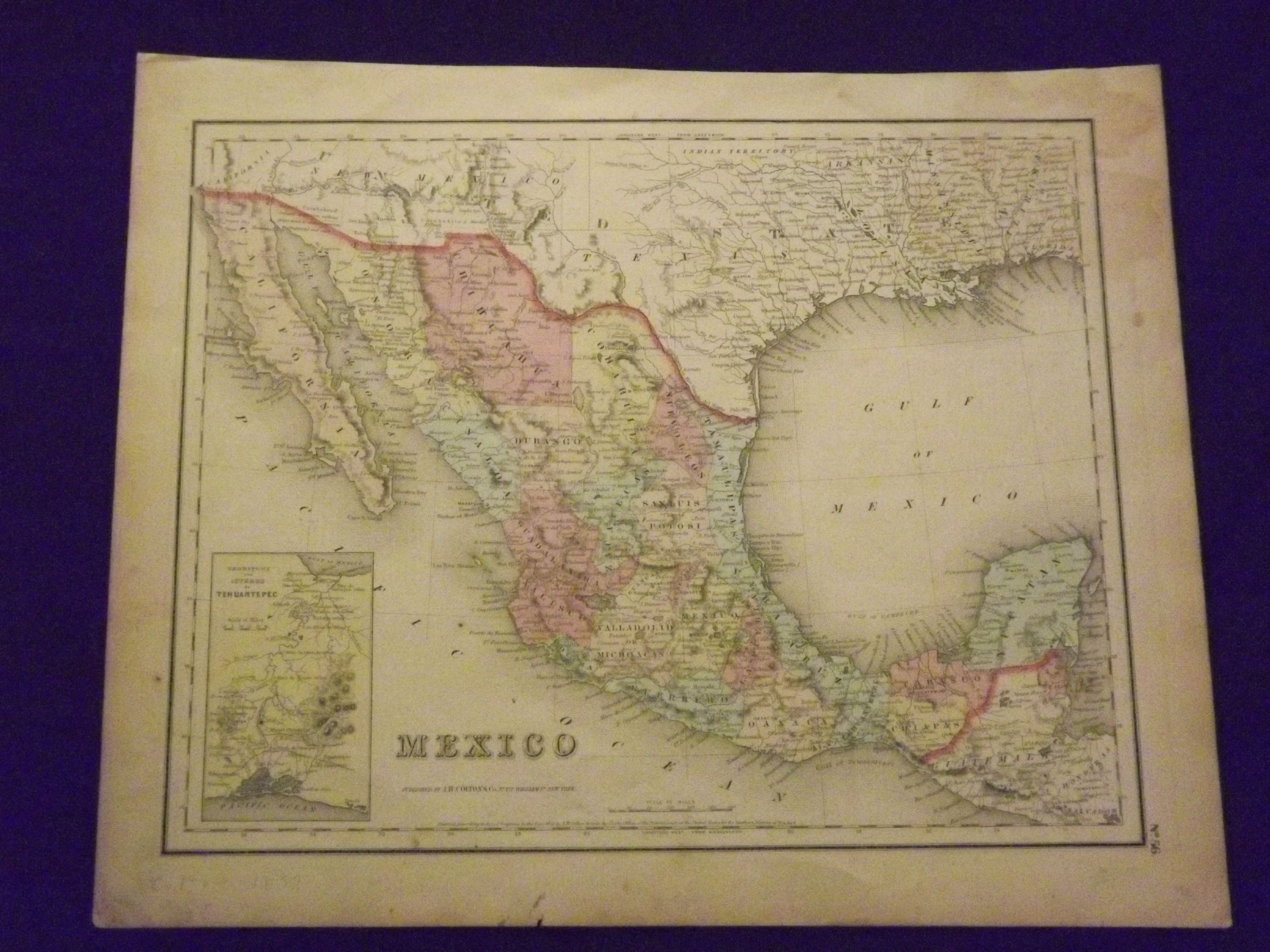 Colton, J.H. Colton's Map of Mexico. New York: J.H. Colton & Co., 1857. Unbound, colored engraved map, decorative boarder, double page 16"x 13". Slight toning and aging, a little staining in right margin, a couple of small chips in bottom margin; overall bright and clean and in very good condition. Maps are wrapped with acid free board, or in rigid sleeves. Beginning with J. H. Colton (1800-1893), the Colton family published atlases for over 30 years. Colton's Atlas of the World was first published in 1855 in a large two volume set. In 1857 it became Colton's General Atlas, and Colton's sons, George Woolworth and Charles B. would take over the business. This early map of Mexico is probably from the 1857 edition of Colton's General Atlas, even though the copyright date on the map indicates 1855. This page map is fairly colorful, and has an inset showing the territory of Tehuantepec. Ristow 313-326.