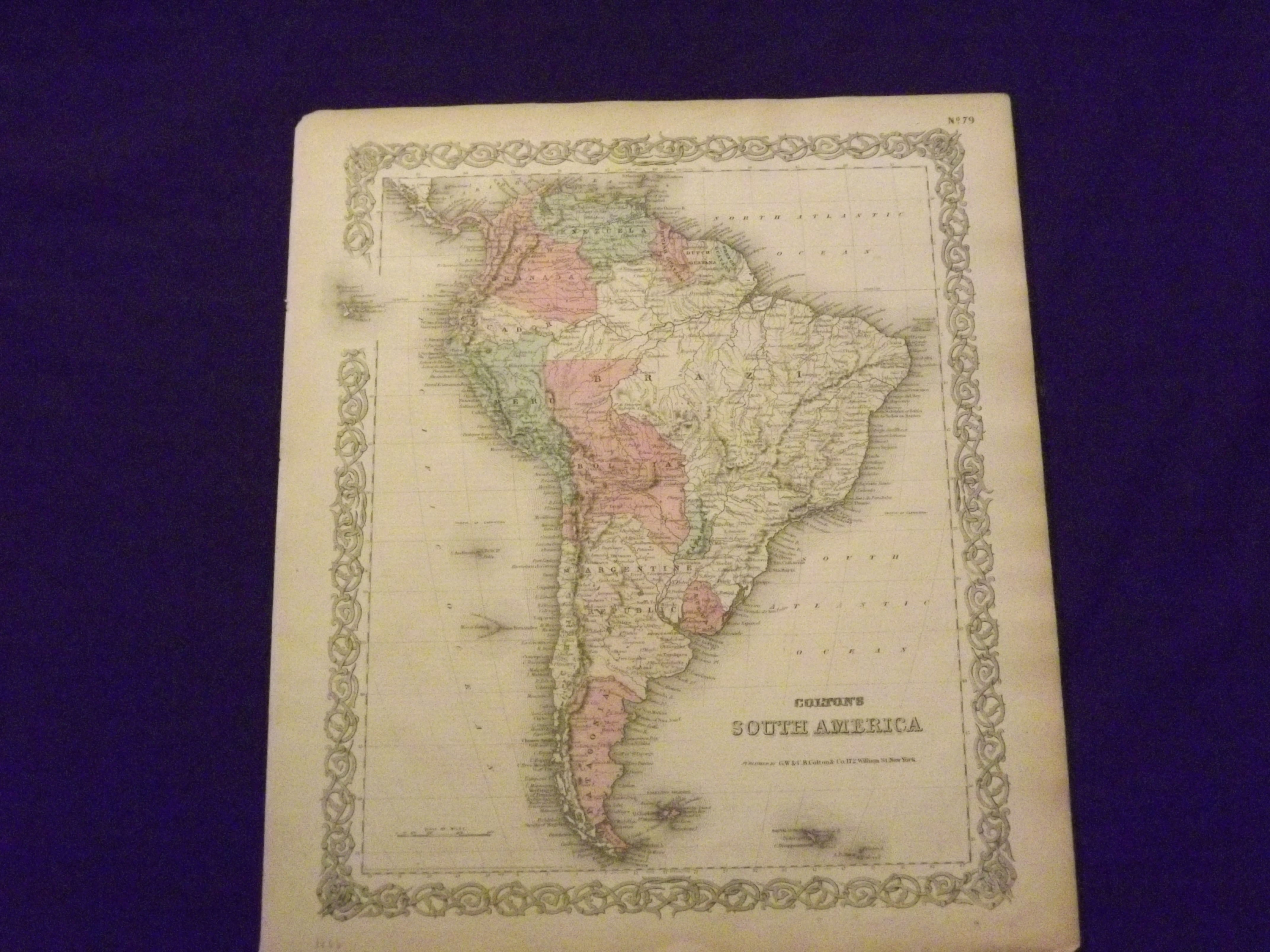 Unbound, colored engraved map, 16" x 13". Slight toning, darkening and aging; otherwise bright and clean overall and in very good condition. Maps are wrapped with acid free board, or in rigid sleeves. Beginning with J. H. Colton (1800-1893), the Colton family published atlases for over 30 years. Colton's Atlas of the World was first published in 1855 in a large two volume set. In 1857 it became Colton's General Atlas, and Colton's sons, George Woolworth and Charles B. would take over the business. This pre Civil War map of South America is from the 1866 edition of Colton's General Atlas, even though the copyright date on the map indicates 1855. May require extra postage. Ristow 313-326.