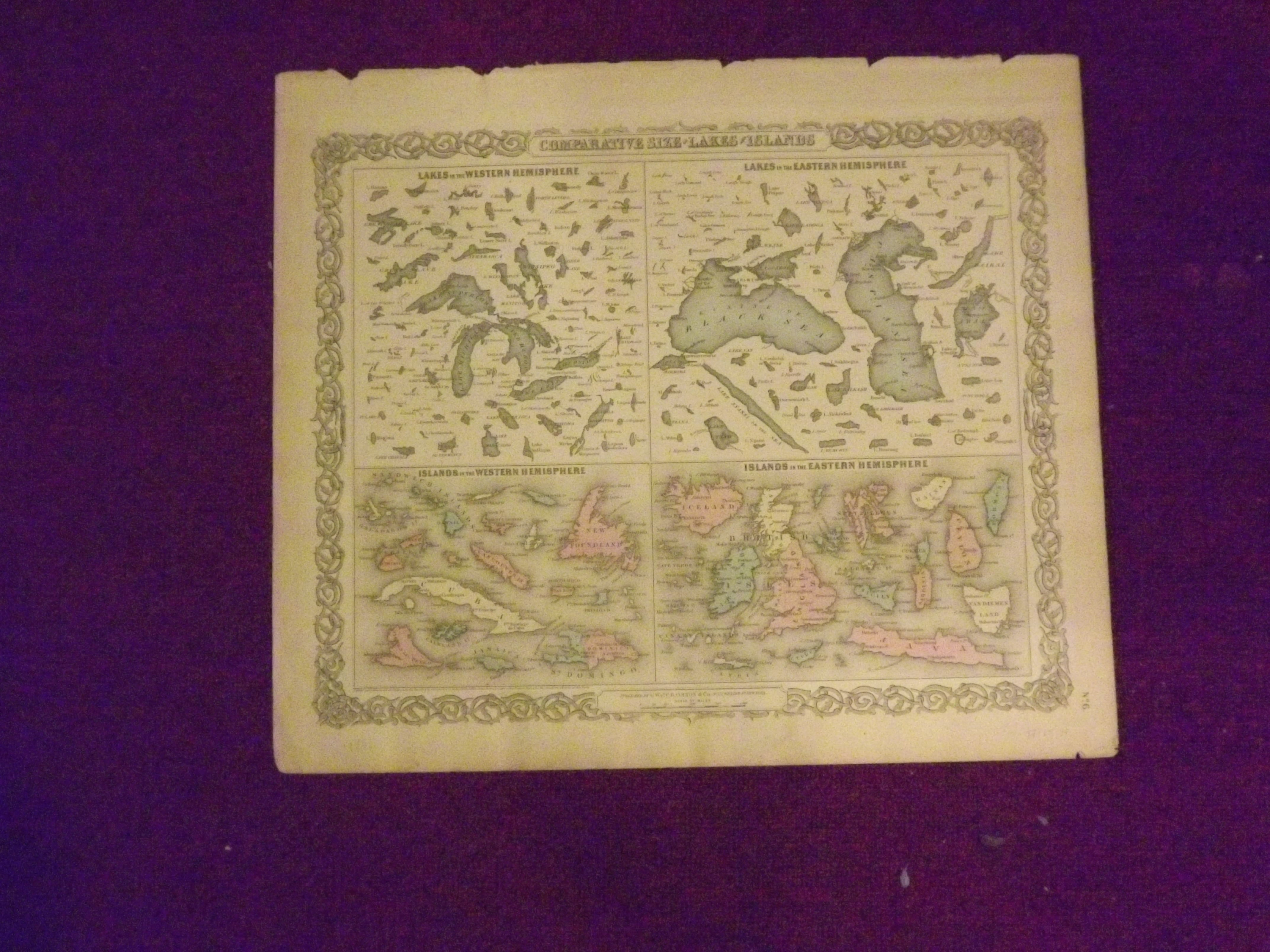 Unbound, uncolored engraved map, 16 " x 13". Slight toning and aging, a little creasing; overall in very good condition. Maps are wrapped with acid free board, or in rigid sleeves. Beginning with J. H. Colton (1800-1893), the Colton family published atlases for over 30 years. Colton's Atlas of the World was first published in 1855 in a large two volume set. In 1857 it became Colton's General Atlas, and Colton's sons, George Woolworth and Charles B. would take over the business. This is a relatively scarce and unusal map of lakes and islands in the eastern and western hemispheres from the 1857 edition of Colton's Atlas. While the map is partially colored, it provides considerable detail on the subject. Has a straight-line border. Ristow 313-326.